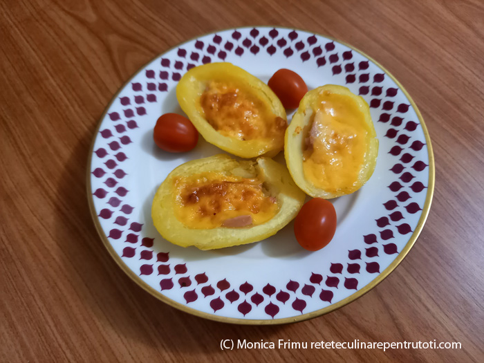 Curățăm cartofii de coajă, tăiem ½ pe lungime, îndepărtăm mijlocul cu o linguriță, lăsând marginea subțire. Tăiem mușchiul file și cașcavalul feliuțe. În fiecare cartof punem o felie de mușchi, presărăm morcov și acoperim cu o felie de cașcaval. Îi ungem la exterior cu ulei și așezăm într-o tavă tapetată cu hârtie de copt, unsă cu ulei. Punem în cuptorul preîncălzit la foc mediu 20 min. Servim calzi.