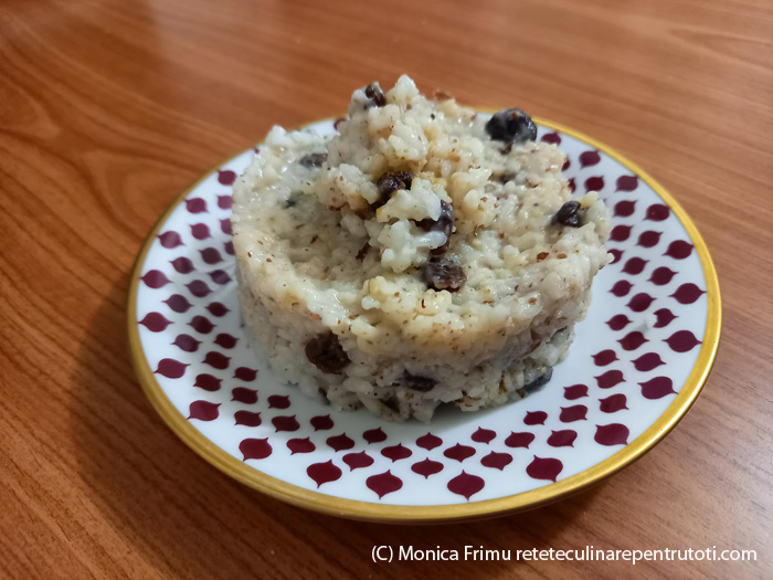 – 200 g orez cu bob rotund, 120 g zahăr, 50 g stafide brune, 70 g alune de pădure, 300 ml lapte, sare, apă