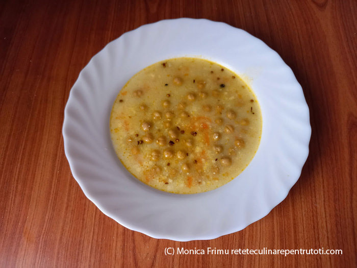 Îndepărtăm cojițele boabelor de năut. Curățăm și tăiem usturoiul mărunt, radem morcovii. Într-o oală amestecăm iaurtul cu făina, zahărul, sarea, apa. Fierbem pe foc mai mare până clocotește, reducem flacăra spre mic și amestecăm din când în când 5 minute. Punem năutul, praful de cuișoare, sare după gust și fierbem 3-4 minute. Separat încălzim uleiul pe foc mare, punem coriandrul, chimenul, susanul, muștarul și prăjim 30 secunde secunde. Adăugăm morcovii și amestecăm 1 minut. Turnăm în oala cu supă, amestecăm 1 minut și stingem focul. Porționăm și servim.