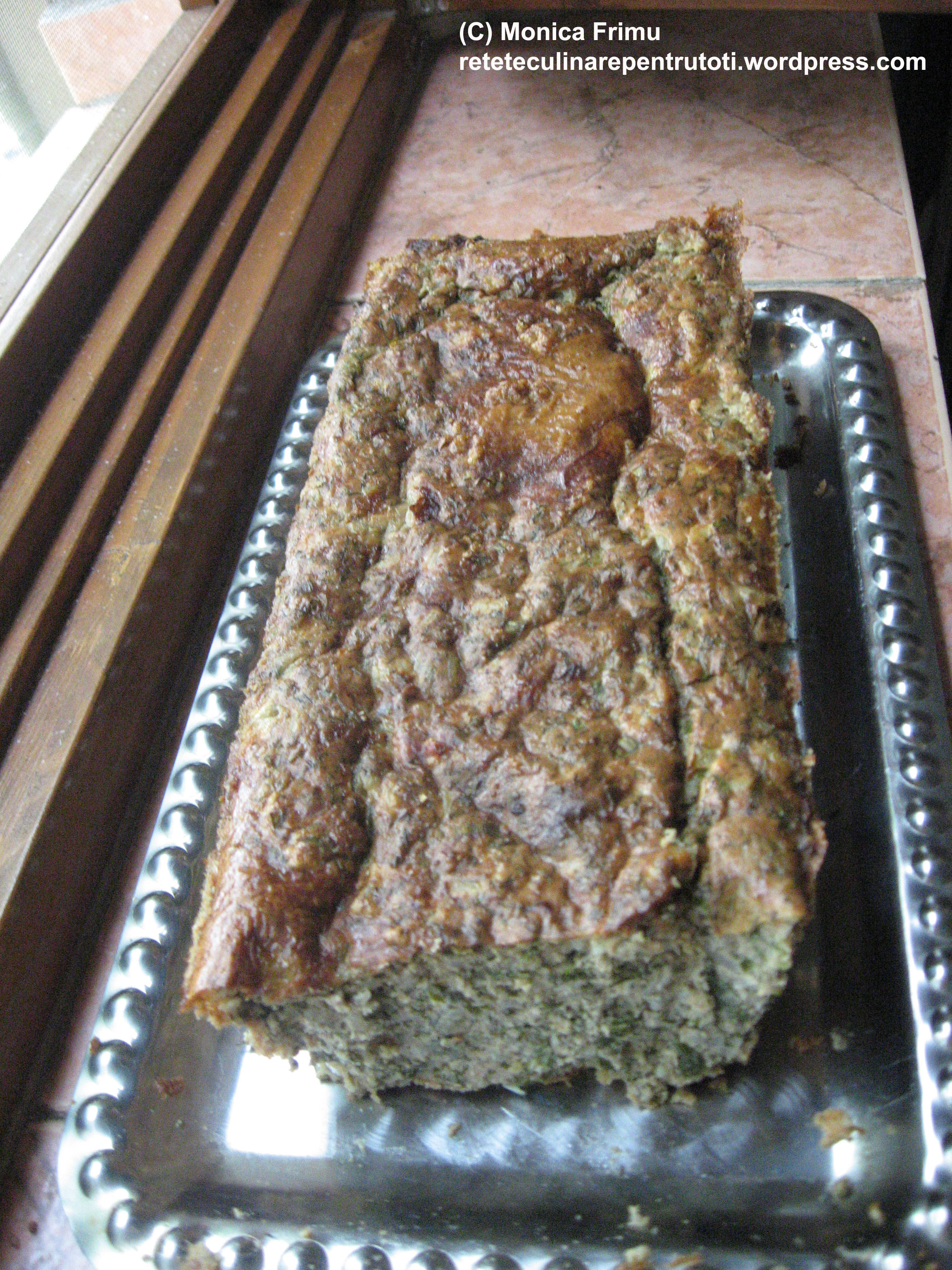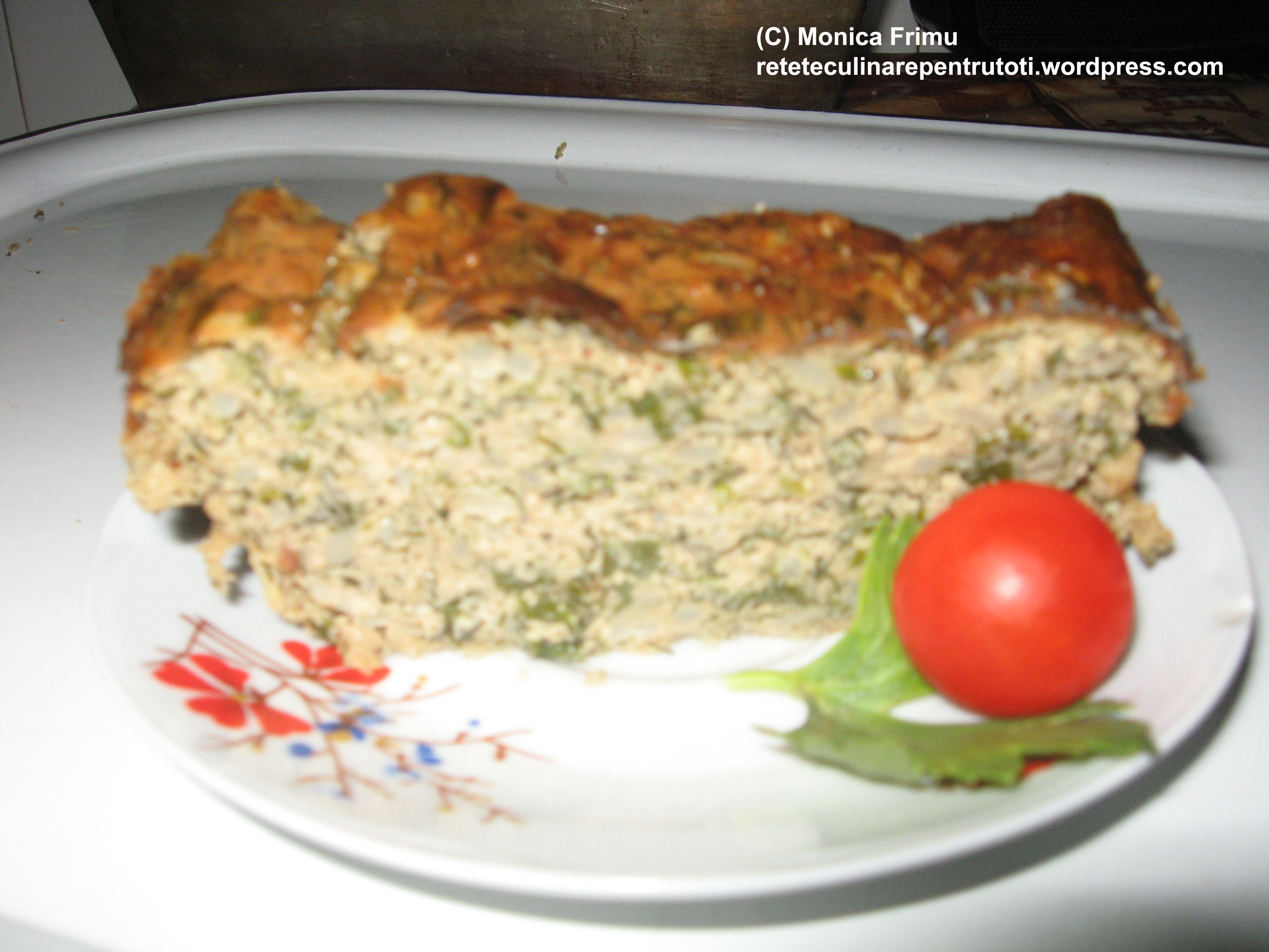 În forma de chec unsă cu ulei şi tapetată cu pesmet se toarnă compoziţia, peste ea se pune un ou bătut, se pune la cuptor 30-45 min. (se poate mânca împreună cu salată verde)