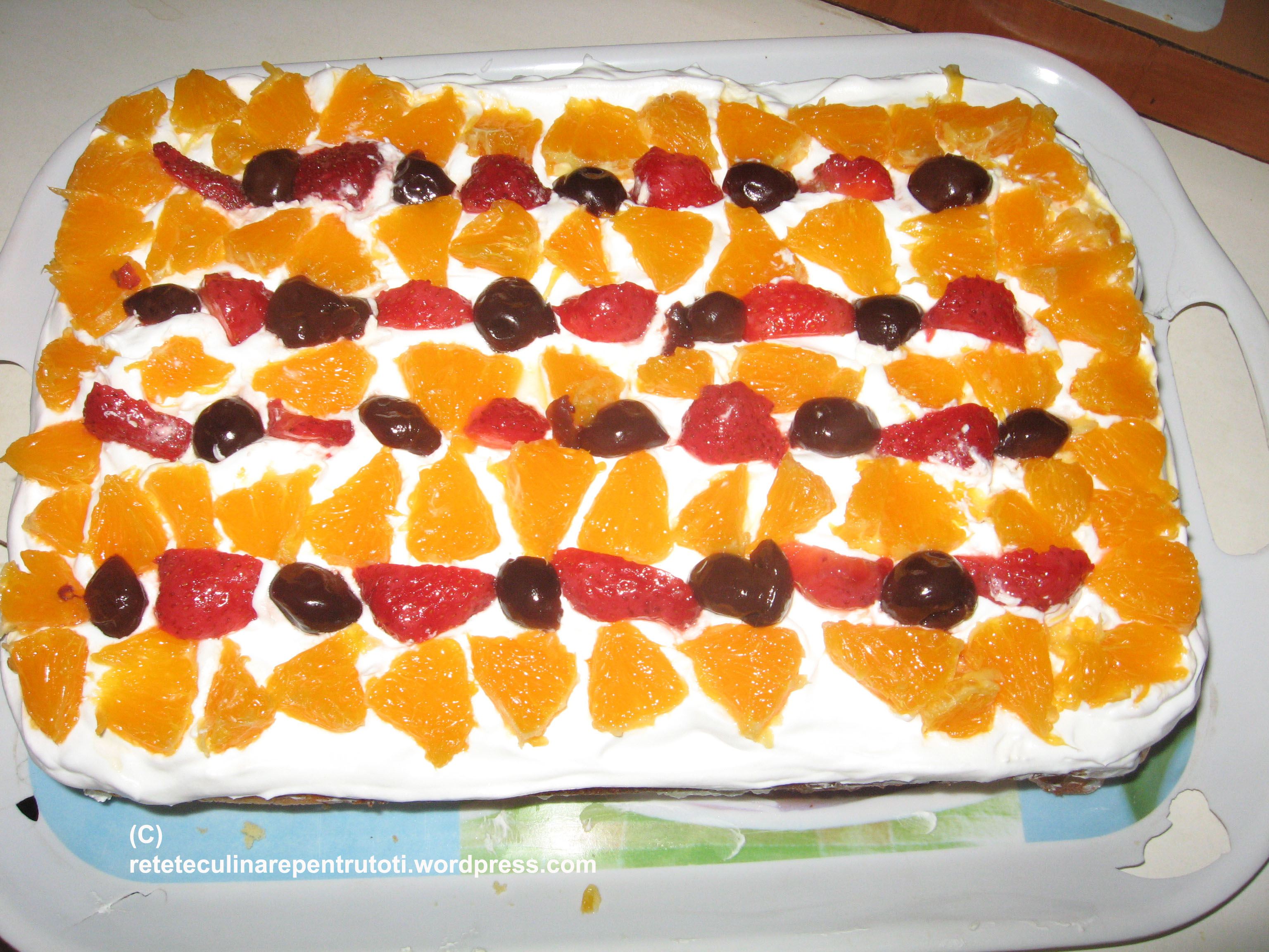 CREMA: 450 g iaurt, 3 linguri zahăr, 1 plic zahăr vanilat, 20 g gelatină, 200 ml frișcă; în plus fructe și frișcă pt. decor