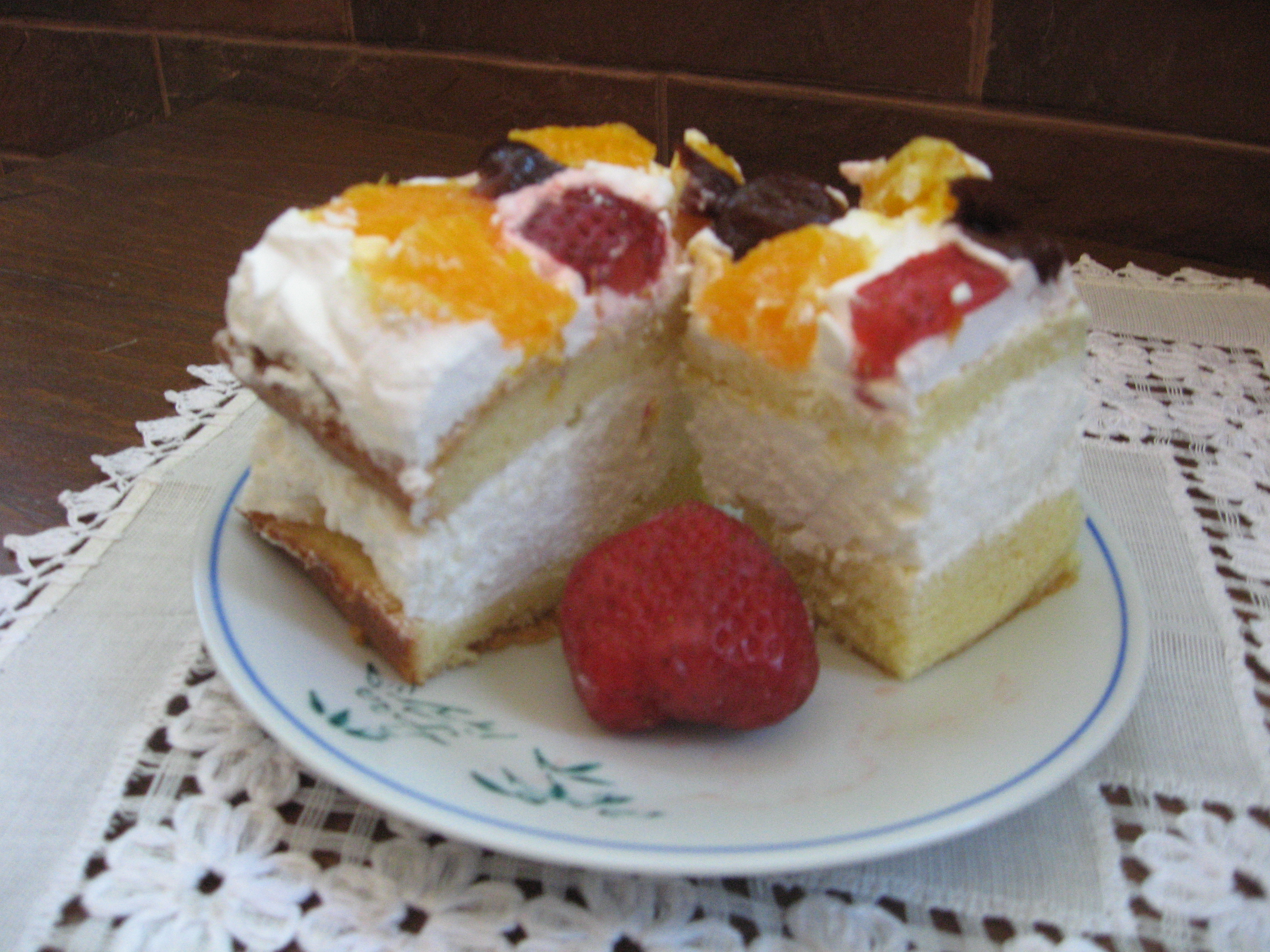 Dizolvăm gelatina în 100 ml apă rece 10 min. apoi dizolvăm pe foc mic și răcorim. Frecăm zahărul cu iaurtul până se topeşte, apoi adăugăm zahărul vanilat, gelatina și omogenizăm. Punem în frigider 30 min. Mixăm frișca tare și încorporăm în cremă. Mai ţinem încă 15 min. la rece. Întindem crema între blaturi şi punem prăjitura încă câteva ore la rece. Scoatem şi ornăm cu frişcă şi fructe.