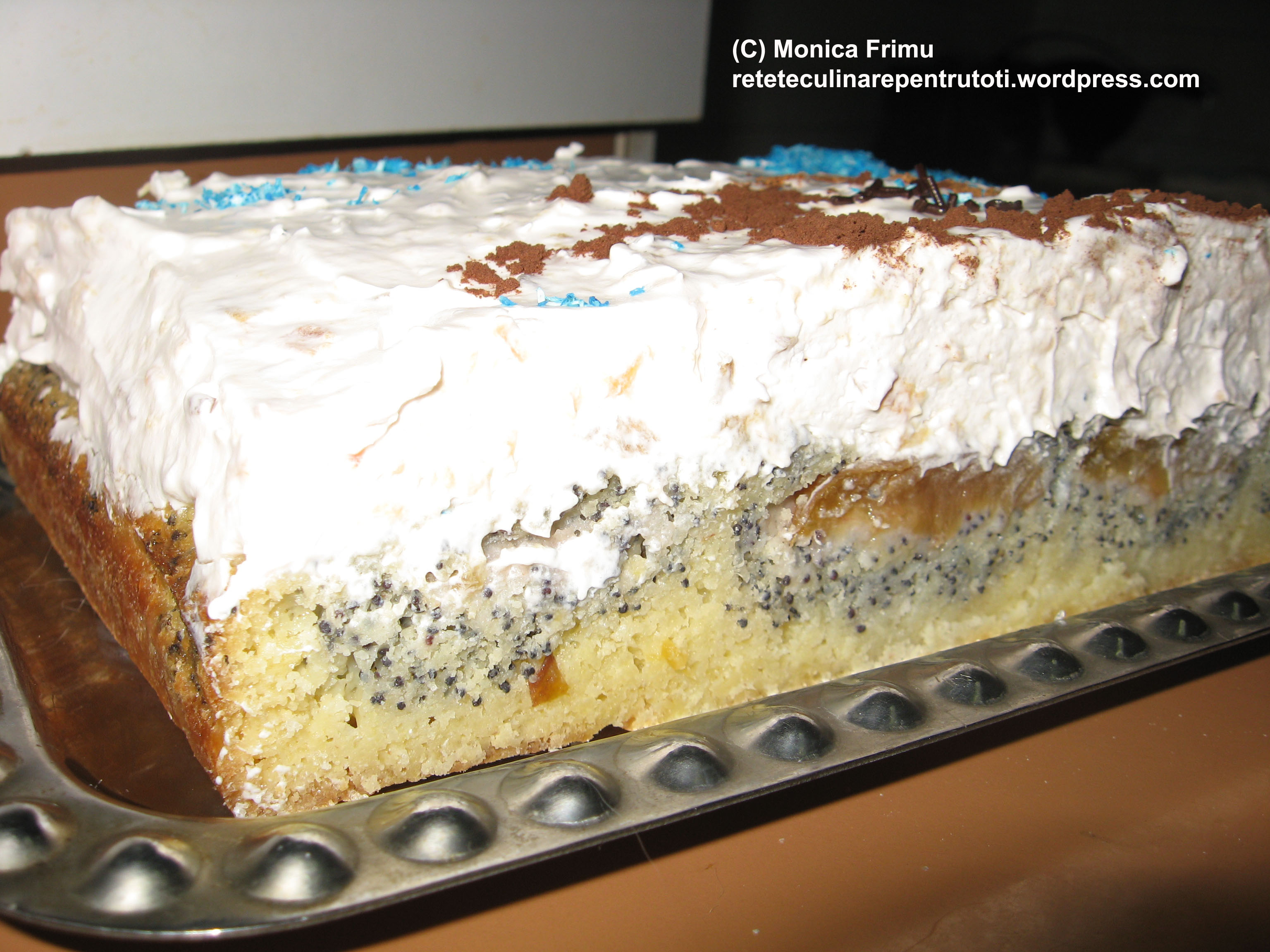 Prunele se taie în sferturi, 1/4 din ele se taie mărunt. Frişca se bate tare şi se ţine la frigider. Macul se macină. Margarina se freacă cu 150 g de zahăr apoi se amestecă cu sarea, ouăle, praful de copt stins în lapte, făina, obținând aluatul. În jumătate amestecăm macul.