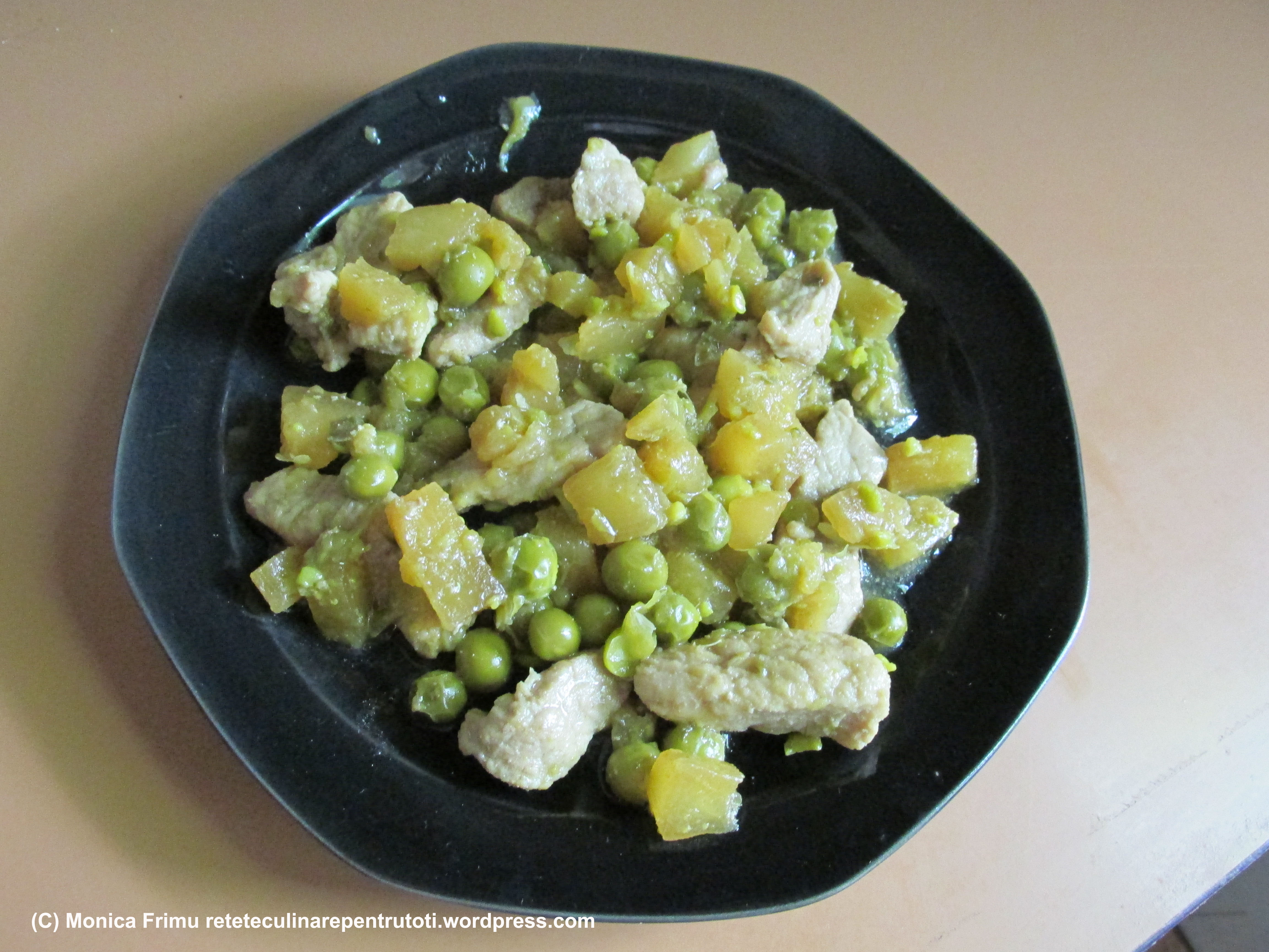 Fierbem orezul și ținem deoparte. Tăiem carnea bucăți de 1×7,5 cm. Scurgem ananasul; dacă mazărea e congelată o decongelăm. Amestecăm bicarbonatul cu ½ linguriță apă rece. În uleiul încins călim ceapa 1 min. amestecănd continuu. Adăugăm carnea și prăjim pe toate părțile până devine maronie. Adăugăm mazărea, ananasul, cele două sosuri de soia, vinul și bicarbonatul dizolvat în apă. Amestecăm și prăjim până se înmoaie carnea. Servim imediat cu orez alăturat.