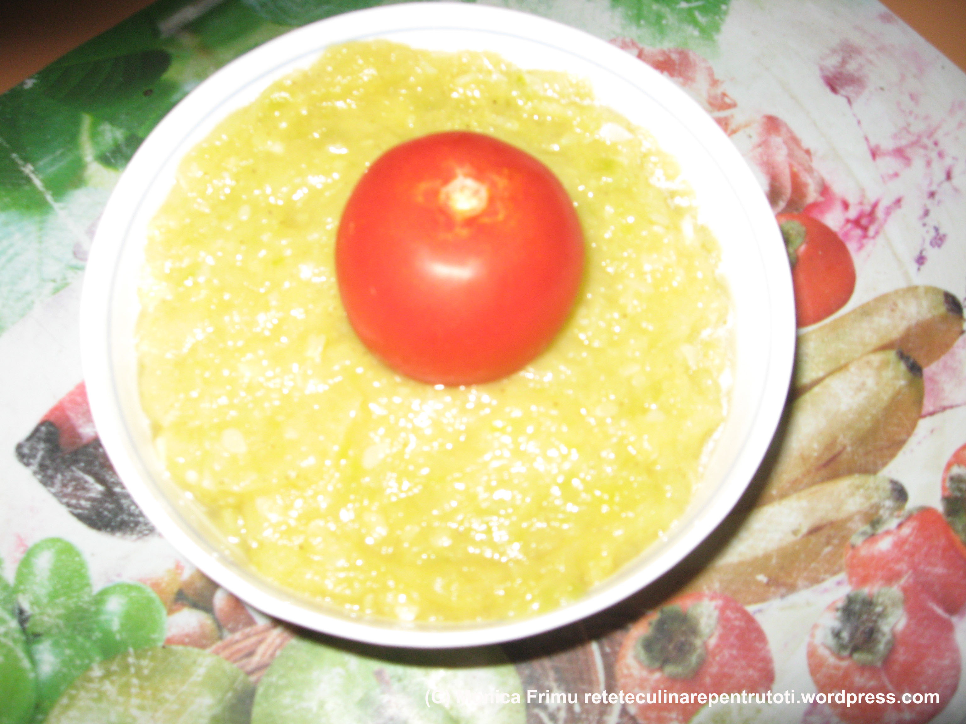 2 dovlecei tăiaţi cuburi se coc în aburi împreună cu 1 căţel de usturoi întreg, se scurg bine+/-1 cartof fiert/1 lingură brânză de vaci (ca să îngroaşe). Se pasează şi se amestecă cu sare, piper, chimen măcinat şi ulei turnat ca la maioneză, până obținem o pastă. Se păstrează la frigider.