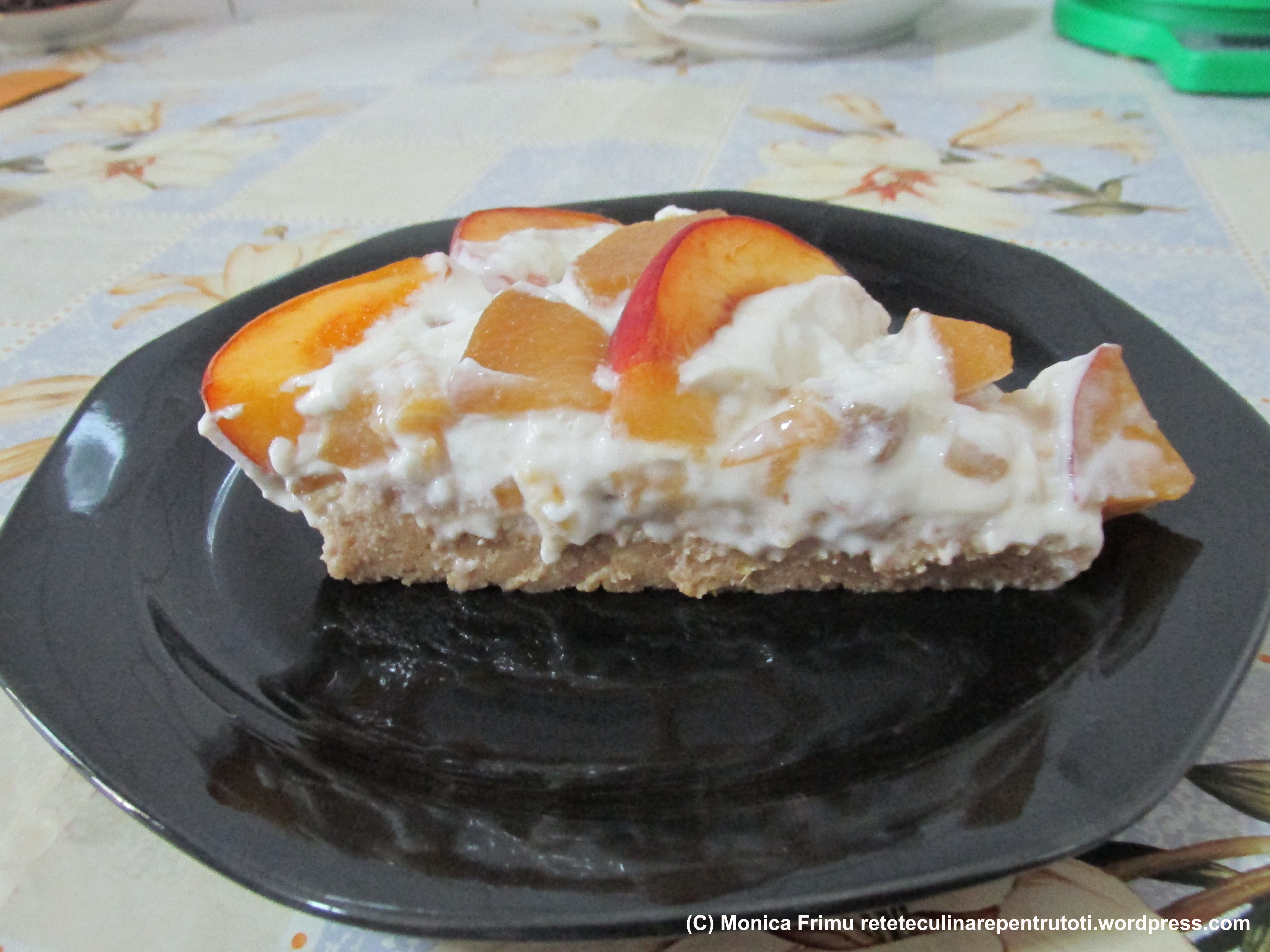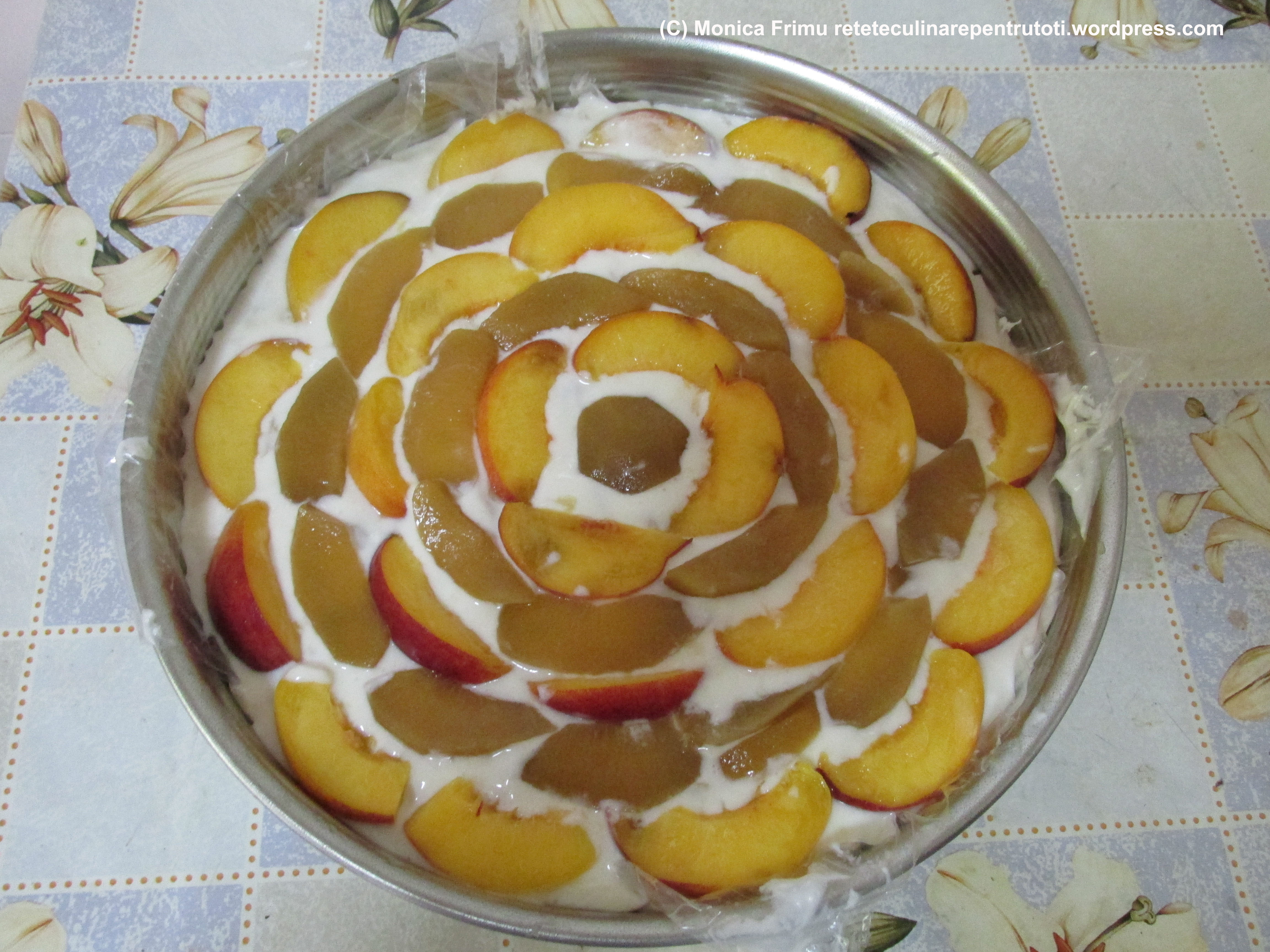 Scurgem piersicile din compot și tăiem cubulețe. Păstrăm pentru decor. Amestecăm pe foc 100 ml suc din compot cu zahărul tos și untul, până se dizolvă și răcorim. Amestecăm cu biscuiții. Taptăm o formă de tort cu folie alimentară și punem biscuiții pe fund, presând ușor. Punem în frigider 15 min.