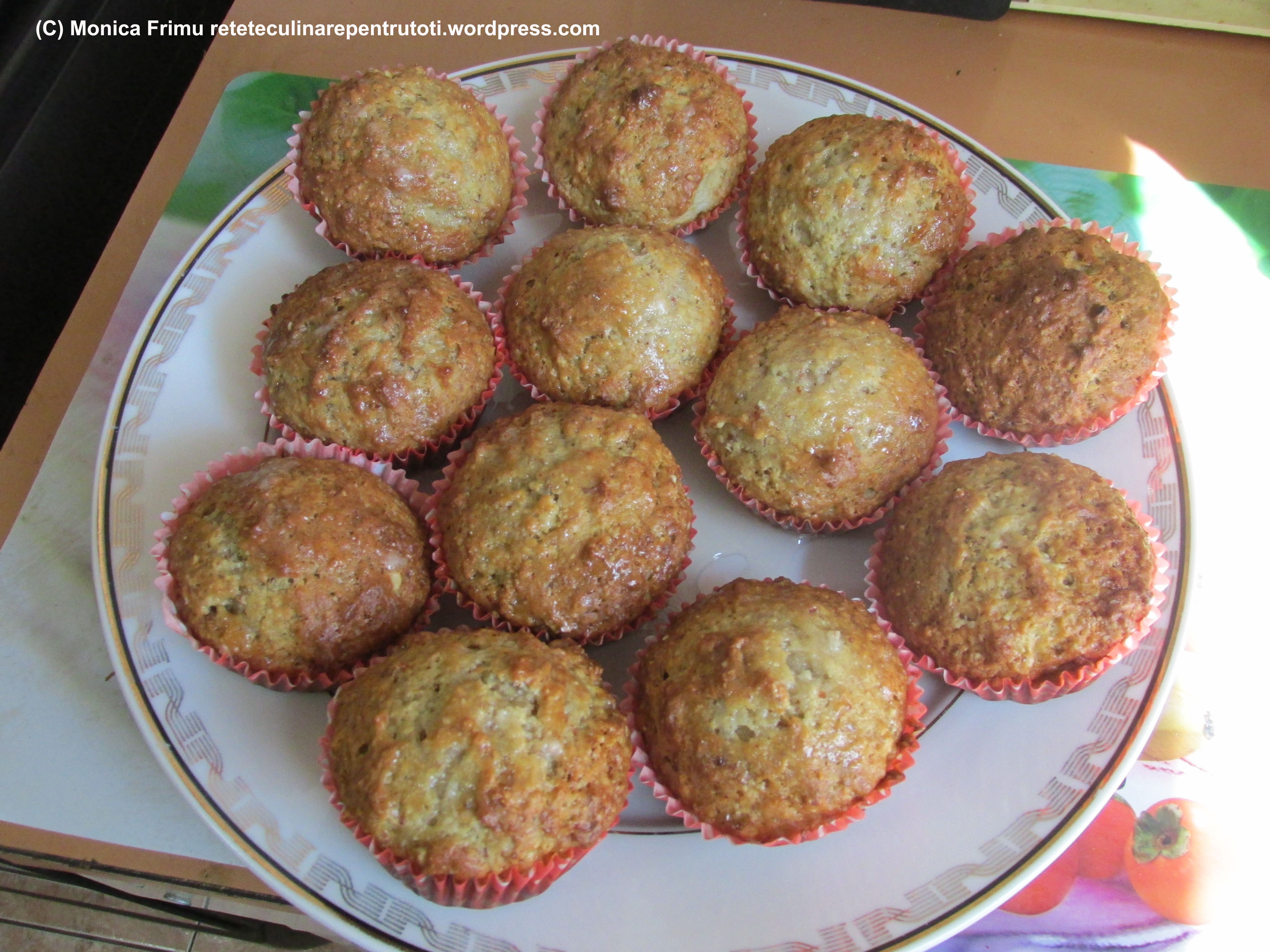 Amestecăm 550 g de făină, 1 praf de copt, 1 linguriţă de bicarbonat, 100 g de nucă măcinată şi 300 g de zahăr. Separat amestecăm 2 banane şi 2 pere moi zdrobite cu 1 linguriţă esenţă de vanilie, 2 ouă bătute, 100 g unt topit şi răcit. Cu lingura amestecăm cele 2 compoziţii, punem în forme tapetate cu hârtie, în cuptorul preîncălzit la foc mediu (180) aprox. 15 min. Răcim şi deasupra turnăm glazură. (eu am pus un amestec din 3 linguri de zahăr praf şi zeama de la ½ lămâie)