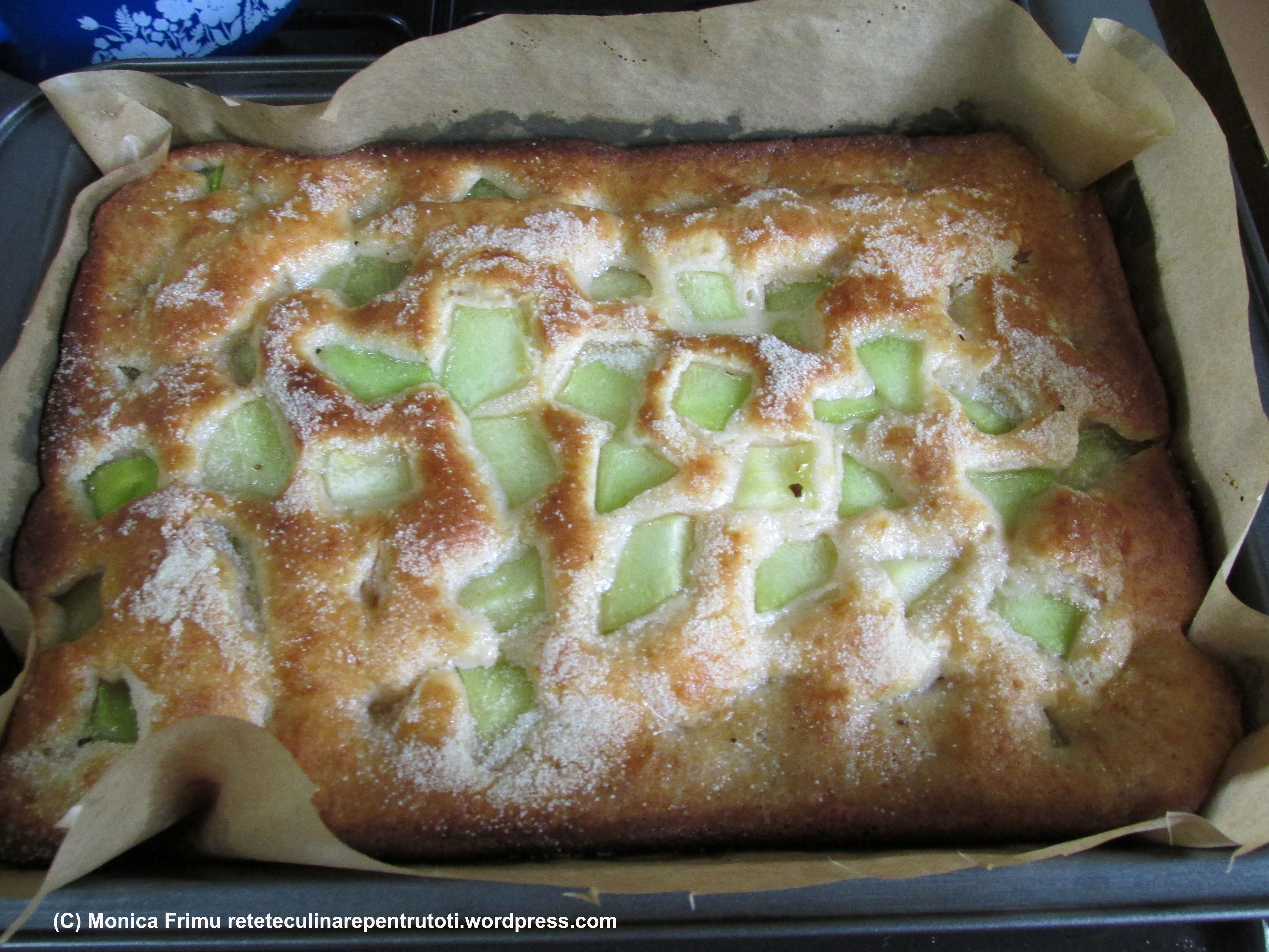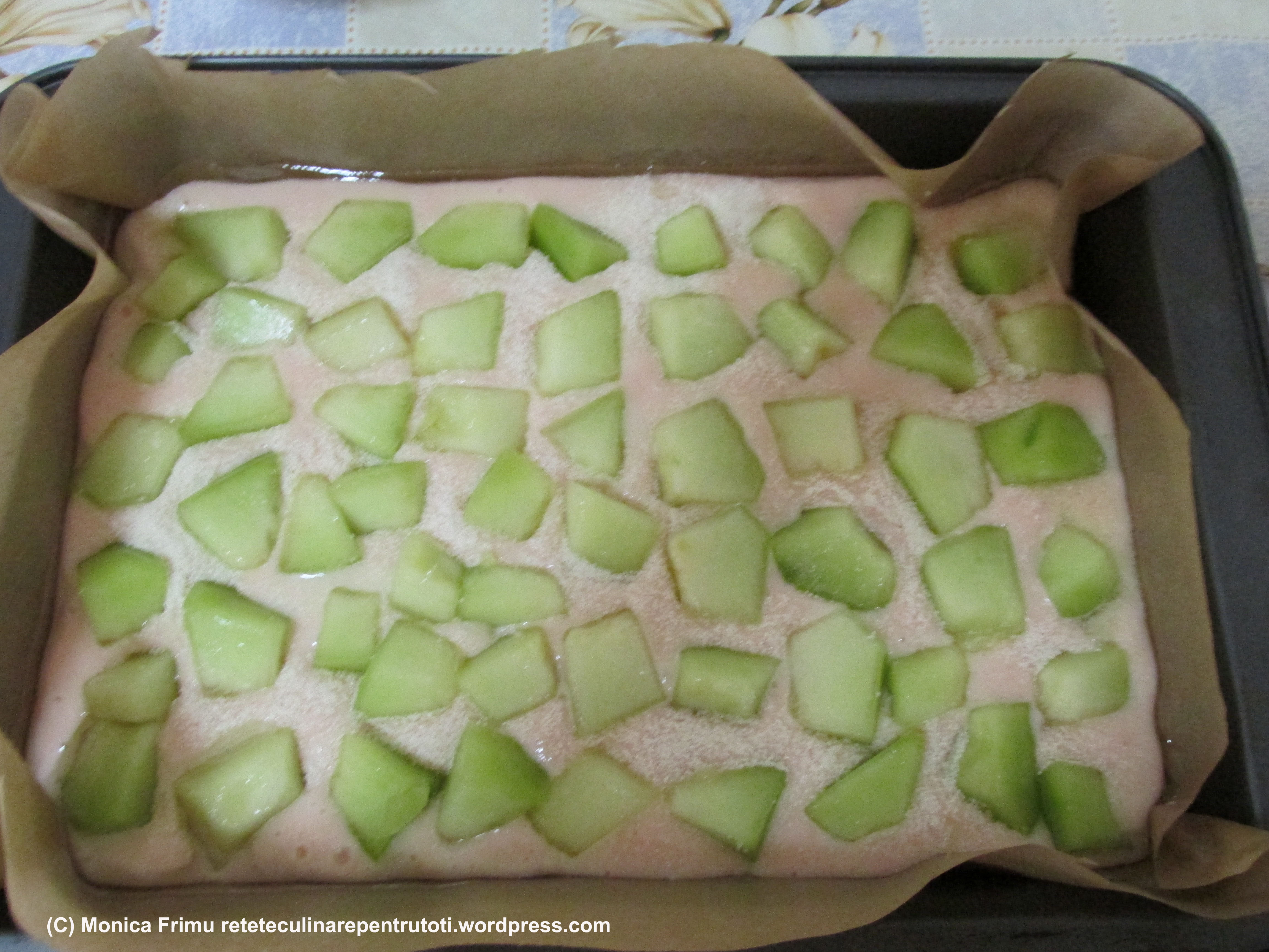 Se bat 2 ouă cu 1 cană de zahăr, apoi treptat adăugăm 1 cană de ulei şi 1 cană de lapte, 1 zahăr vanilat, 1 praf de copt, 2 căni cu vârf de făină, 1/4 linguriţă esenţă de portocale până devine ca o smântână groasă. Punem în tavă tapetată cu hârtie pergament, unsă cu ulei, peste blat 2 linguri de gris, peste 1 castronel de pepene tăiat cuburi.