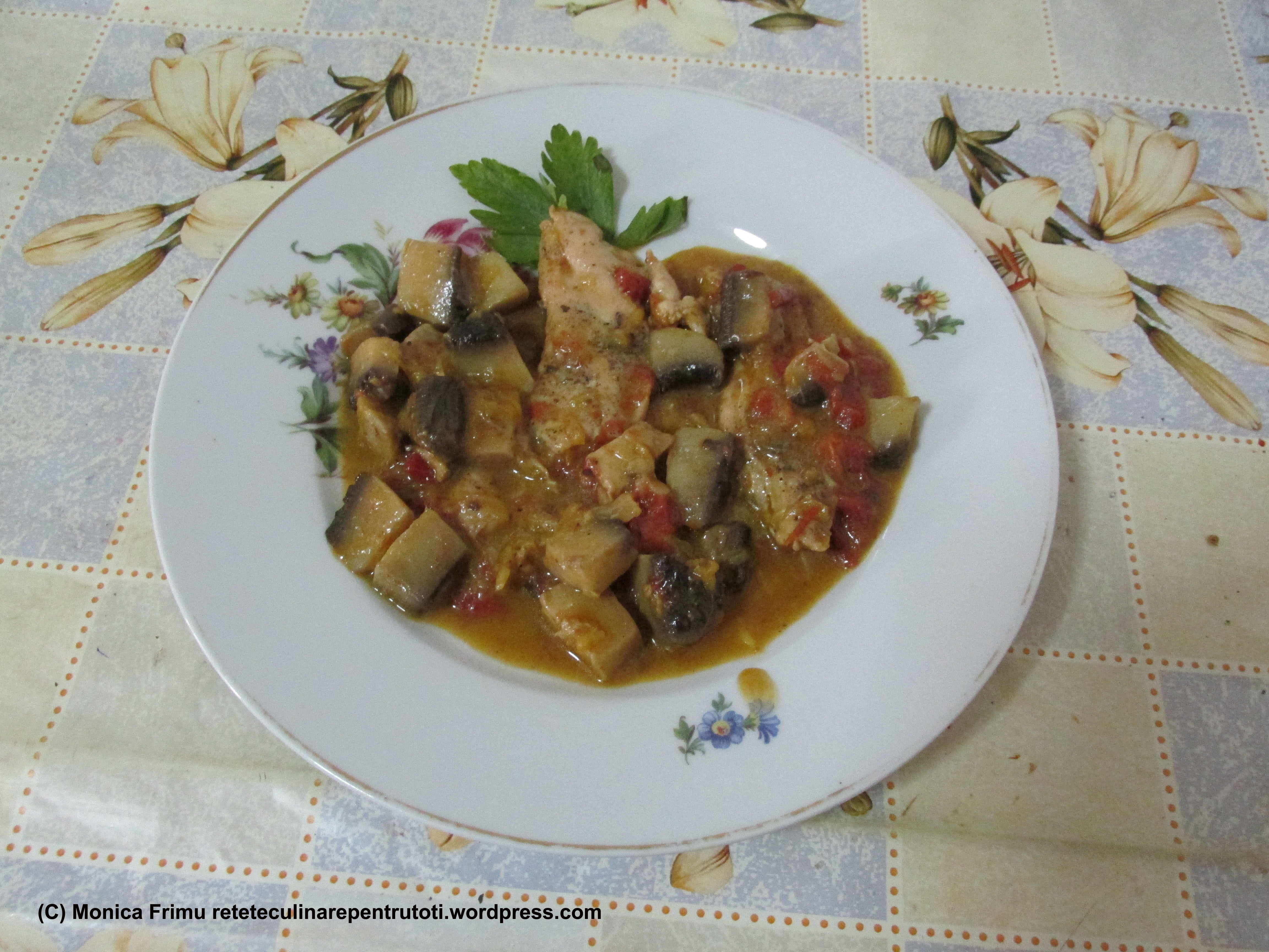 – 1 piept de pui, 2 portocale, 1 linguriţă ghimbir pudră, piper, sare, 1 roşie mare, 200 g ciuperci, 50 ml apă