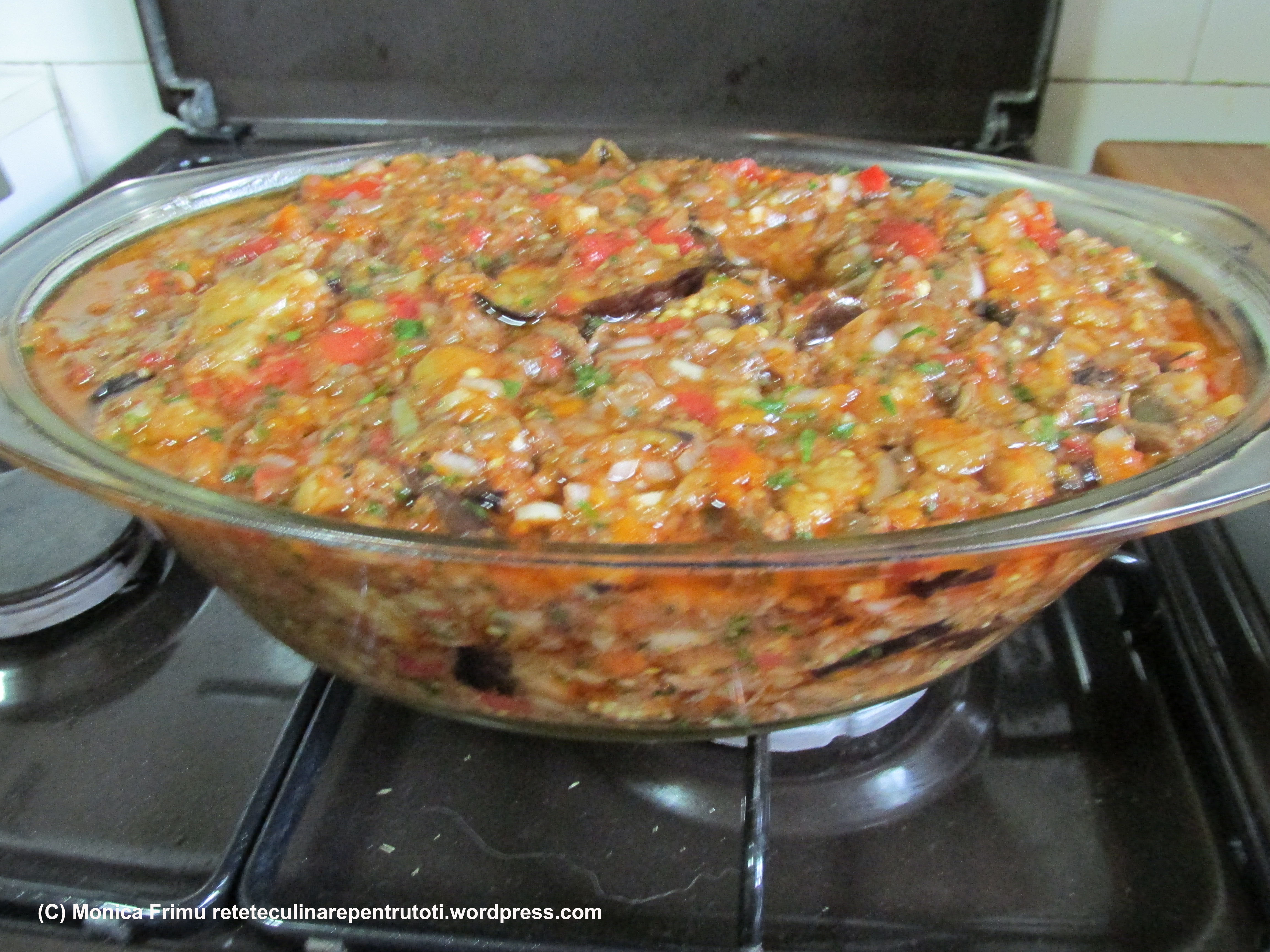 Fierbem câteva minute 4-5 cepe tăiate solzişori, 1 căpăţână de usturoi tăiat mărunt, morcovul şi ceapa din supă pasate, vinetele, apoi adăugăm carnea tăiată cuburi, 500 g de roşii decojite şi tăiate cubuleţe, 1 leg.de pătrunjel verde tocat, sare, piper, cimbru, 1 linguriţă rasă de miere şi supă. Fierbem înăbuşit, cu capac, la foc mic, 10 min.+/-pastă roşii/bulion, apoi punem în Yena, turnăm 1 păhărel de vin alb şi coacem în cuptor 20 min..
