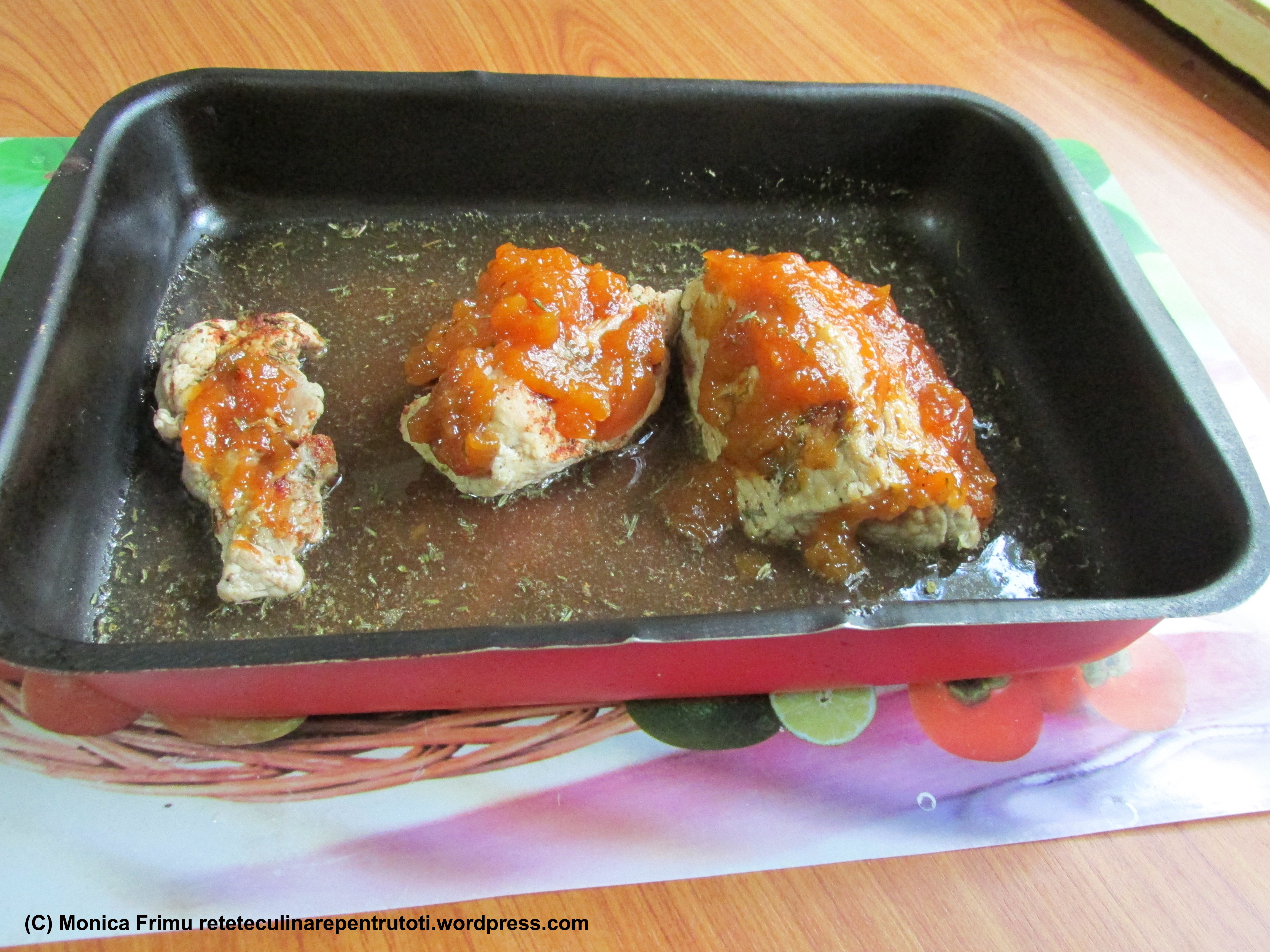 1 kg de cotlet fără os îl împănăm cu căţeii de la o căpăţână de usturoi, îl prăjim câteva minute în puţin ulei, pe ambele părţi, până îşi schimbă culoarea, apoi adăugăm apă cât să-l acopere, sare, piper şi fierbem înăbuşit până când scade apa. Îl punem într-o tavă, adăugăm 150 ml de vin alb demidulce, boia, cimbru, rozmarin, îl ungem cu 4-5 linguri de gem de caise sau prune şi punem în cuptorul preîncălzit până e moale.