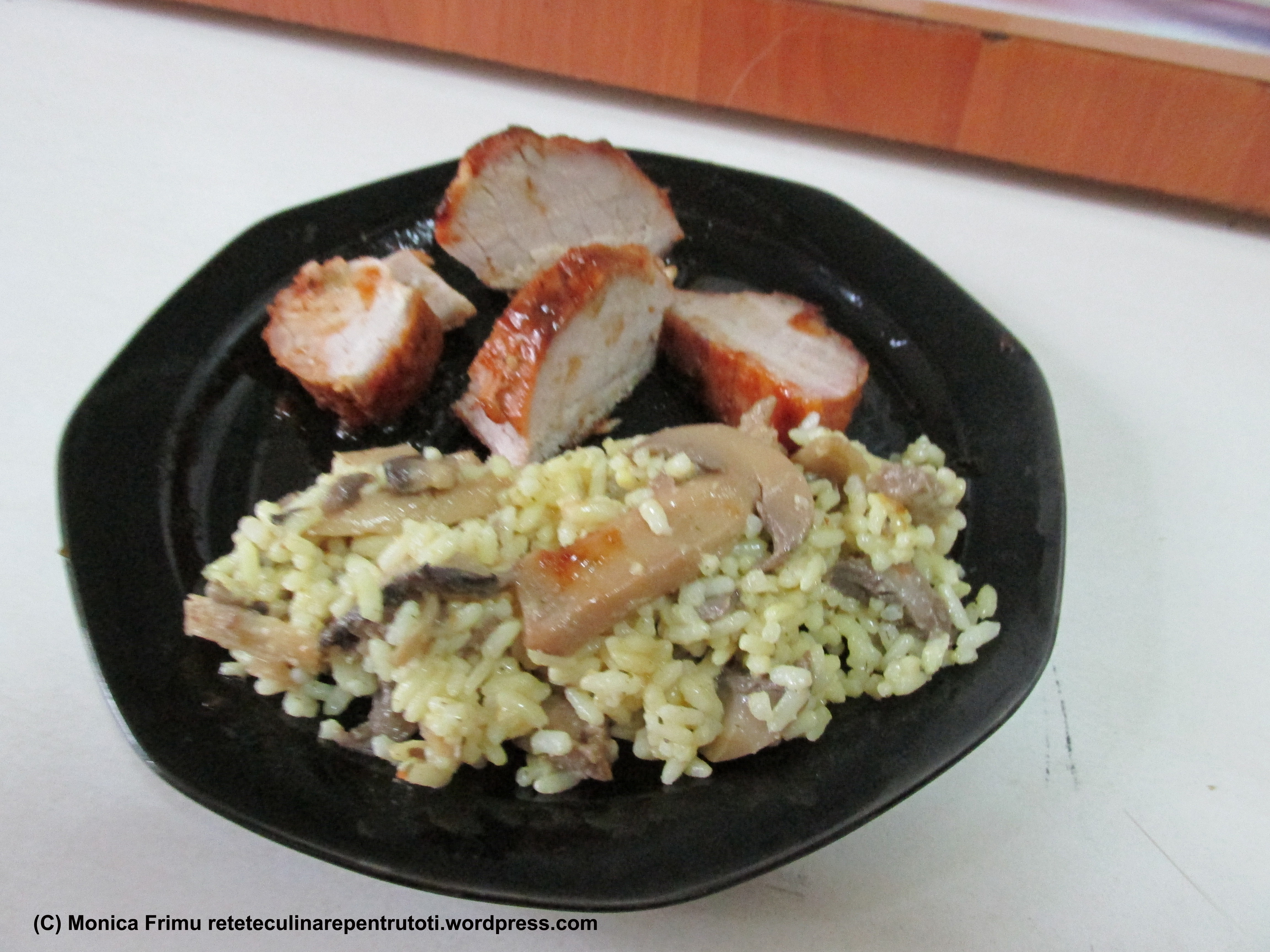 Fierbem în apă cu sare 300 g de orez. Călim în 3-4 linguri de ulei 300 g de ciuperci tăiate felii din conservă, apoi amestecăm cu orez şi punem după gust sare. (putem pune la cuptor 10 min. dacă ne place mai prăjit) Servim cotletul feliat, cu orez.