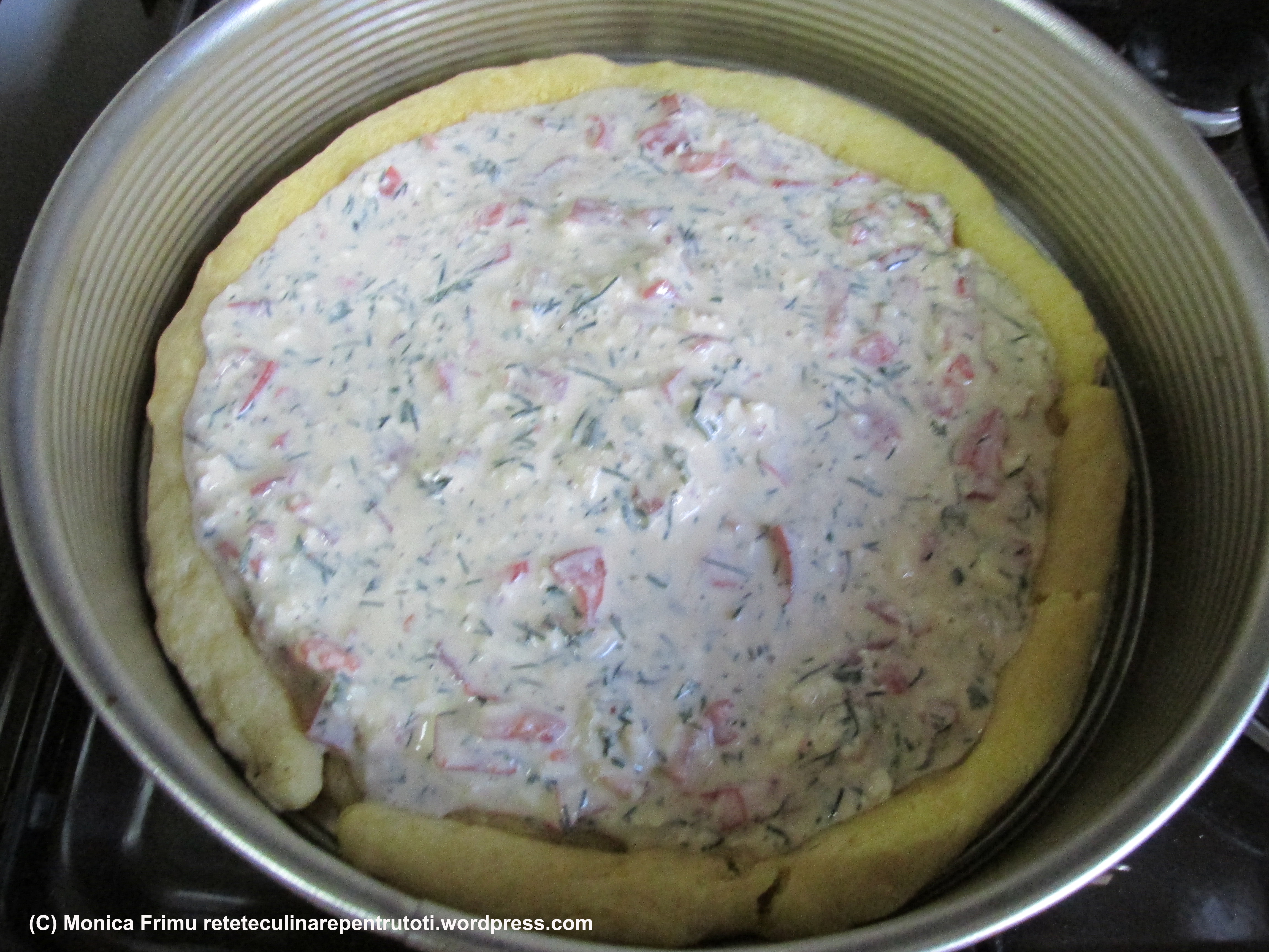 UMPLUTURA: amestecăm 300 g de smântână, 4 ouă bătute, 1 lingură de Gustin (amidon), 50 g amestec de frunze congelate şi mărunţite (ţelină, mărar), adăugăm 2 roşii tăiate cubuleţe mici, 300 g de telemea rasă, piper şi nucşoară. Umplem forma de aluat.
