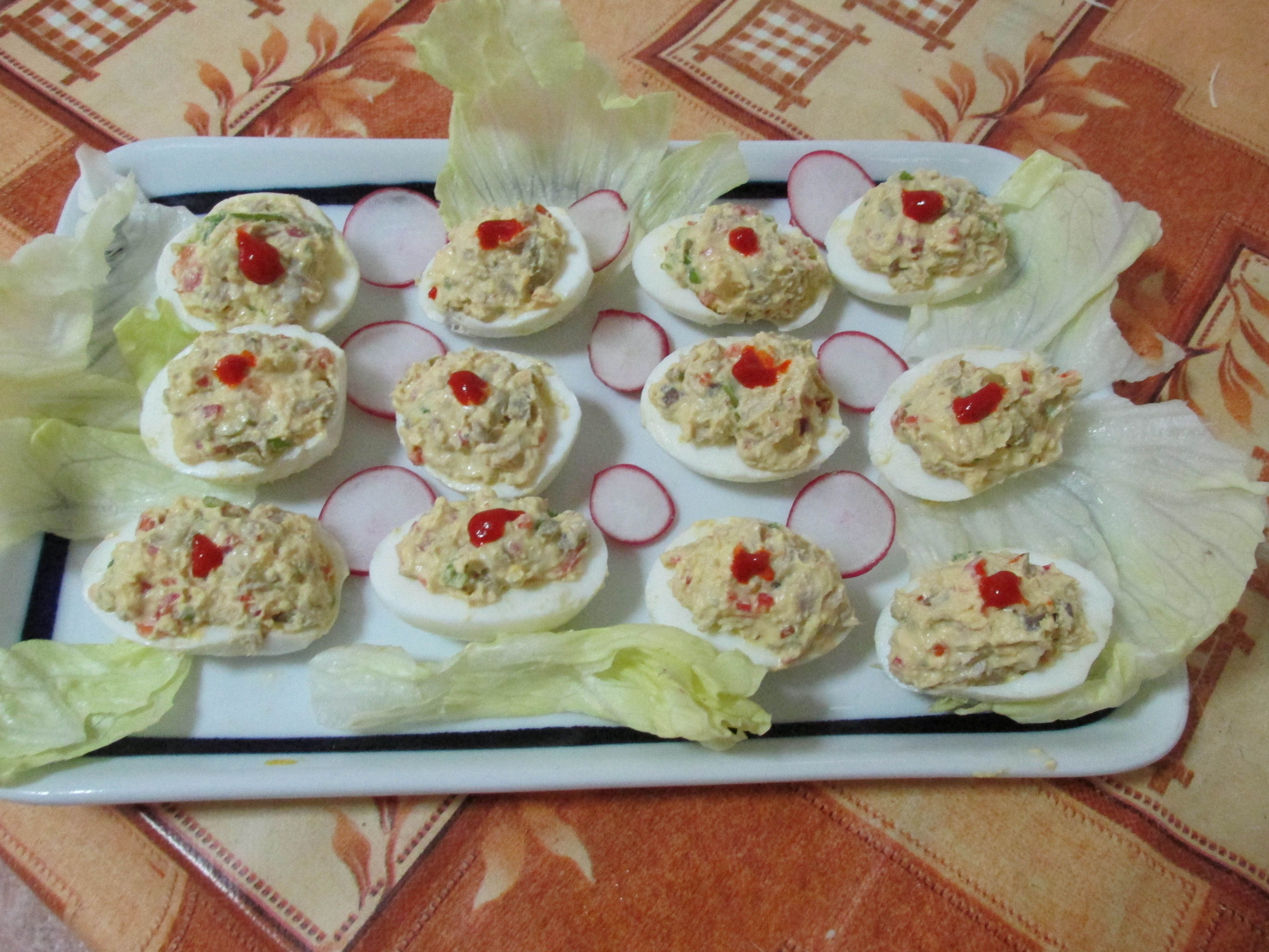 – 6 ouă, 100 g carne fiartă, 1 ardei roşu mic, 1 linguriţă de muştar, câteva măsline verzi, 1 fir de ceapă verde, sare, piper, pătrunjel verde, 2 linguri de maioneză light