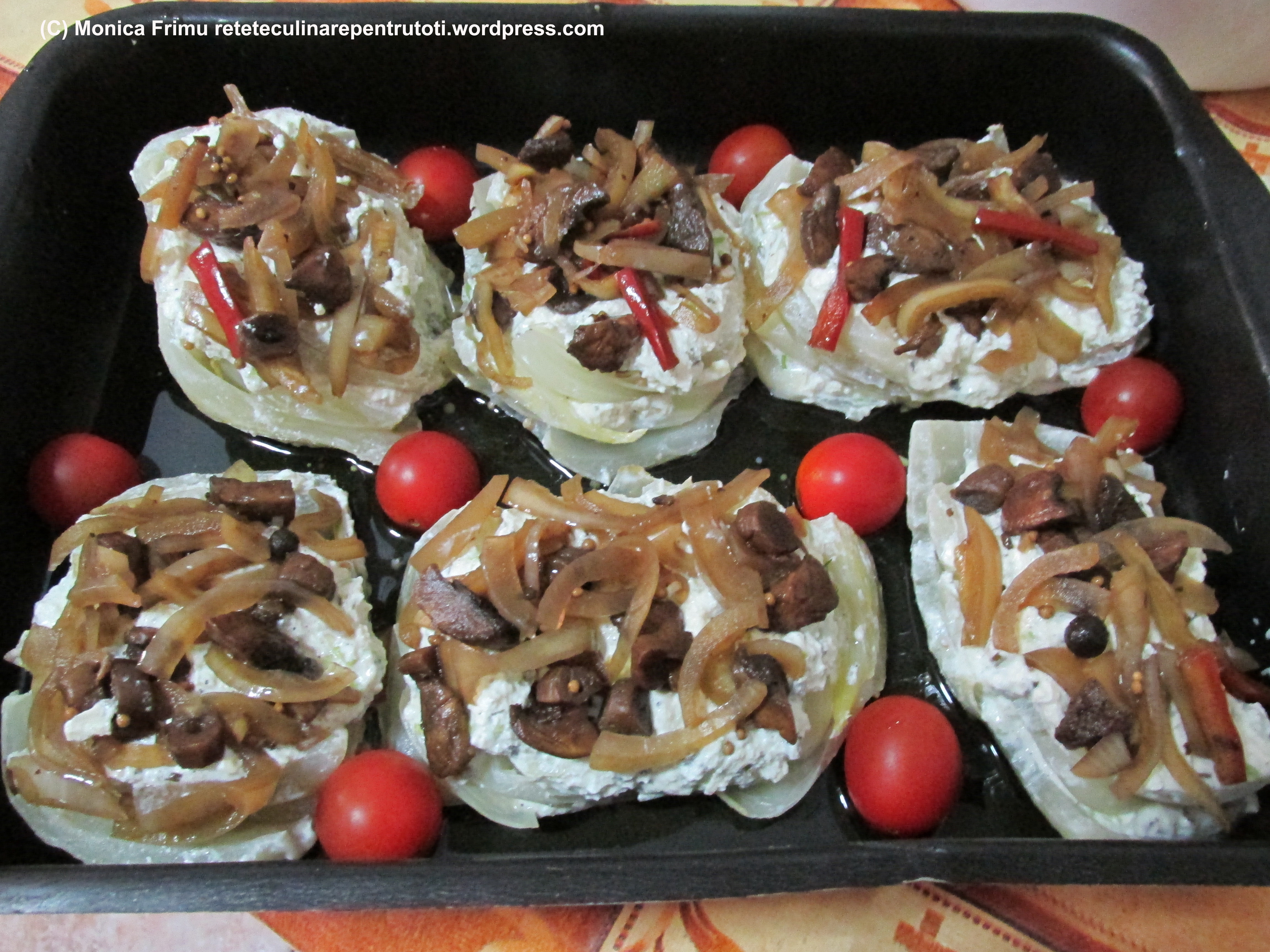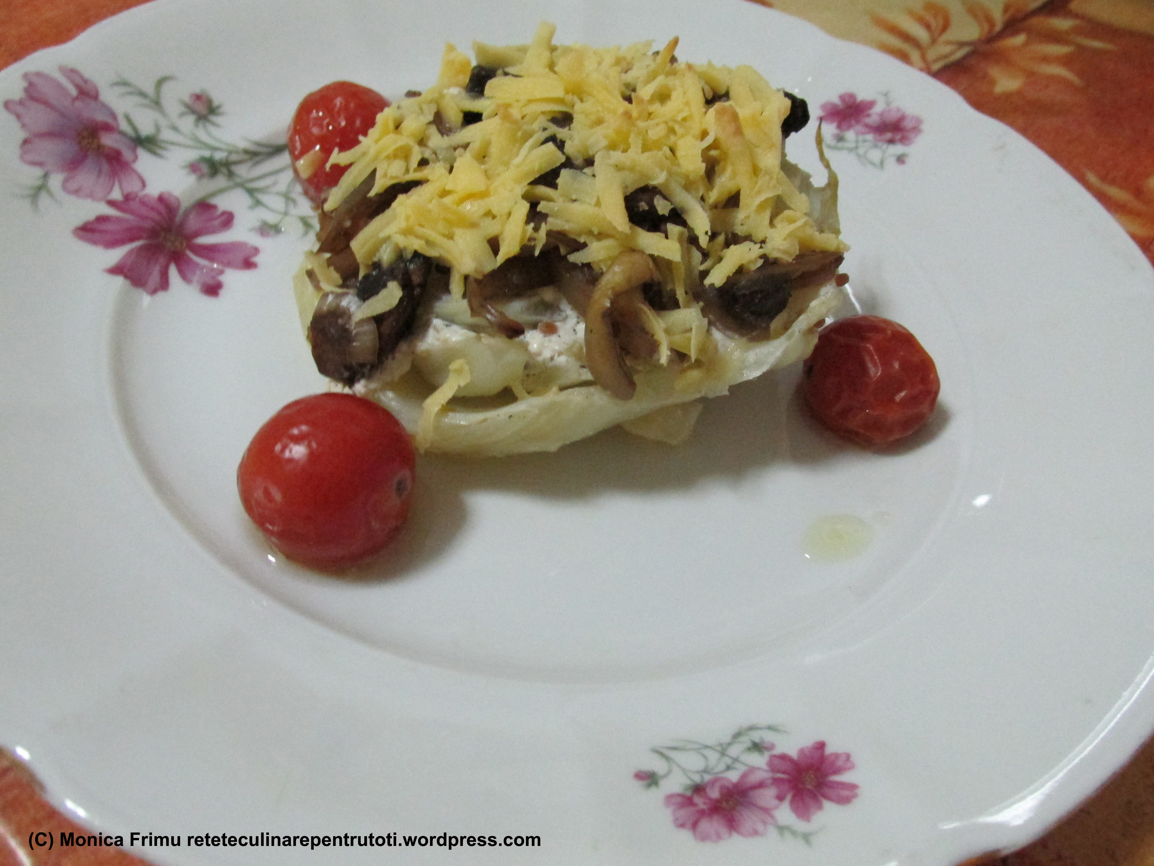 O linguriţă de boabe de muştar, boabele de piper şi frunzele de dafin se pun la fiert într-un litru de apă. Când apa a dat în clocot se adaugă sucul de lămâie şi bucăţile de fenicul tăiate în jumătăţi. Se fierb până se înmoaie puţin, se scot cu o spumieră şi se răcesc. Se curăţă prazul şi se toacă, apoi se amestecă cu brânza de vaci, telemeaua rasă mare, sare, piper după gust şi frunzele de fenicul tocate. Cu compoziţia se umplu bucăţile de fenicul şi între foi. Se așează într-o tavă unsă cu 2 linguri de ulei. Deasupra se pun ciuperci murate, lângă ele roşiile. Se pune tava în cuptorul preîncălzit la foc mai mare (200) aprox. 25 min., până se înmoaie feniculul.
