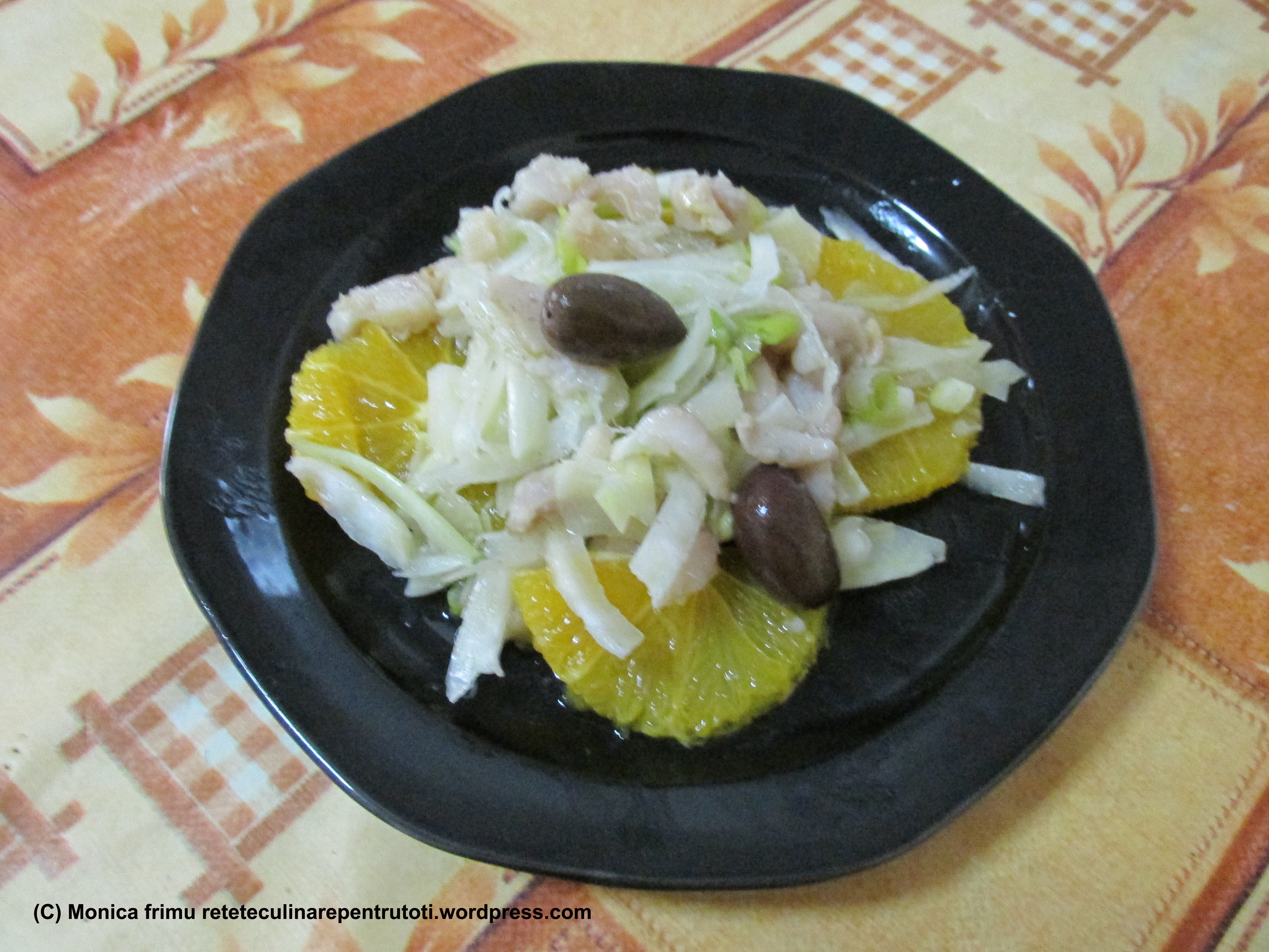 Curăţăm portocalele de coajă, le tăiem rondele și așezăm într-un bol. Ceapa verde o tăiem rondele, feniculul fâşii, le presărăm peste portocale. Tăiem peştele fâșii, punem deasupra în bol, presărăm piper şi stropim cu ulei şi zeamă de lămâie. Decorăm cu măsline Kalamata.
