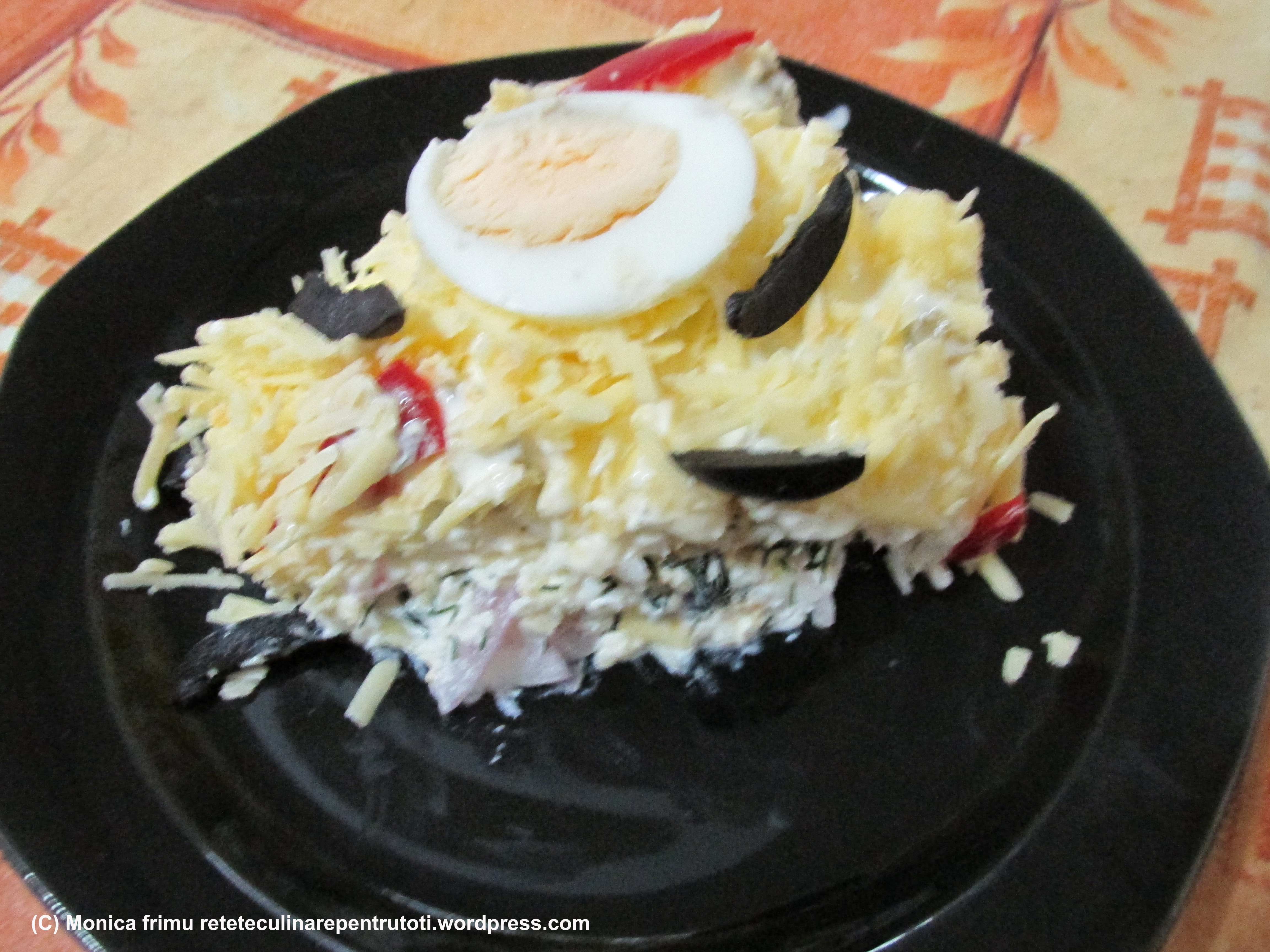 Într-un bol punem pe straturi: 300 g brânză de vaci amestecată cu 3 linguri de smântână, 1 ceapă roşie tăiată solzi, 100 g de telemea rasă mic, 1 leg de mărar tocat, 3-4 ouă fierte rase, 50 g de măsline verzi umplute cu gogoşari tăiate ½, 50 g de brânză Feta tăiată felii subțiri, 6 linguri de maioneză light, 100 g de caşcaval ras mare. Ornăm cu felii de ou fiert, măsline negre şi ardei roşu. Punem în frigider 30 minute, apoi servim.