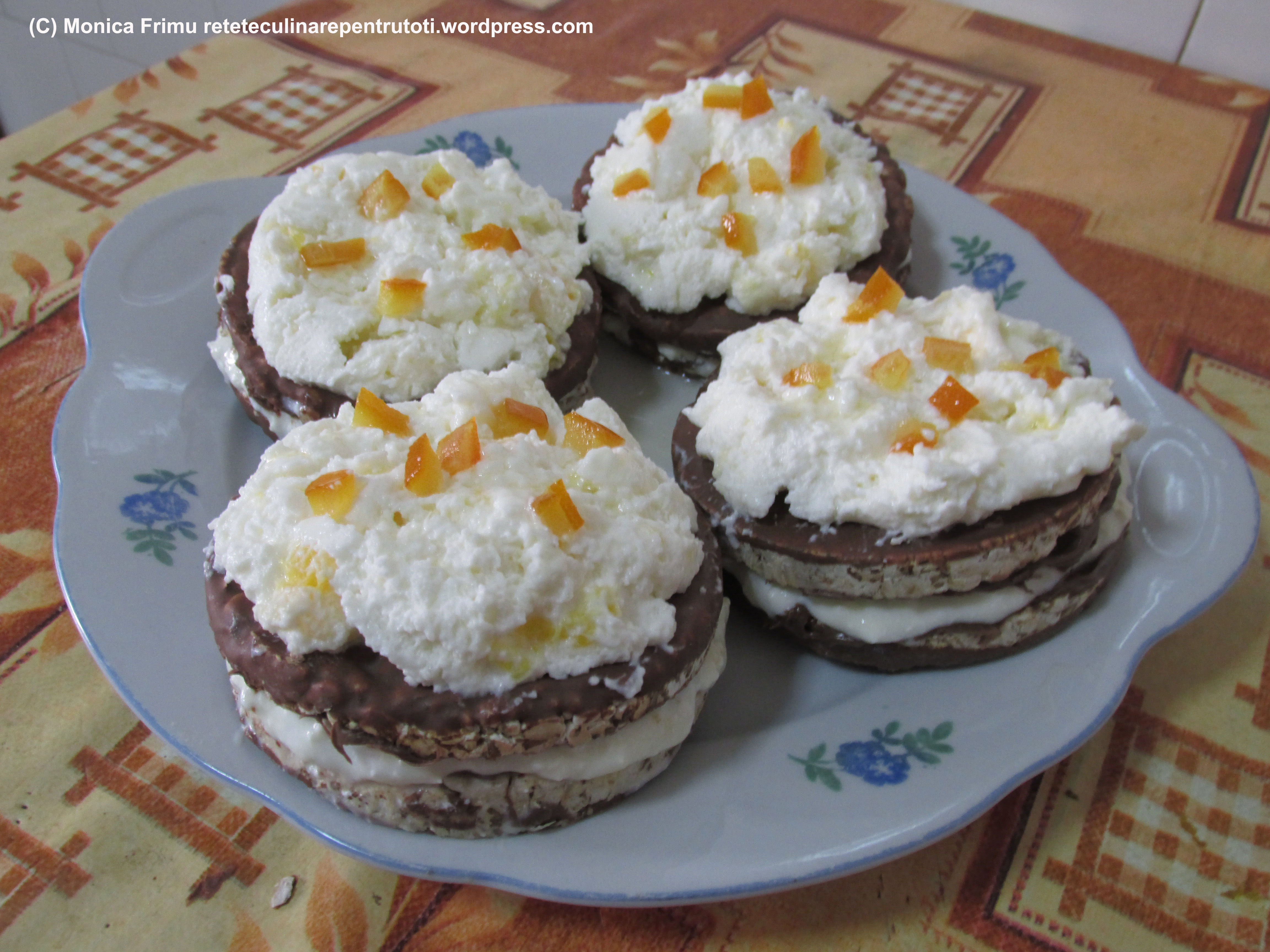 – 8 rondele din grâu expandat, 100 g cremă de ciocolată (din cutie), 200 g brânză proaspătă de vaci cu ananas, 1 portocală, 50 ml frişcă; pentru ornat- dulceață din coji de portocale