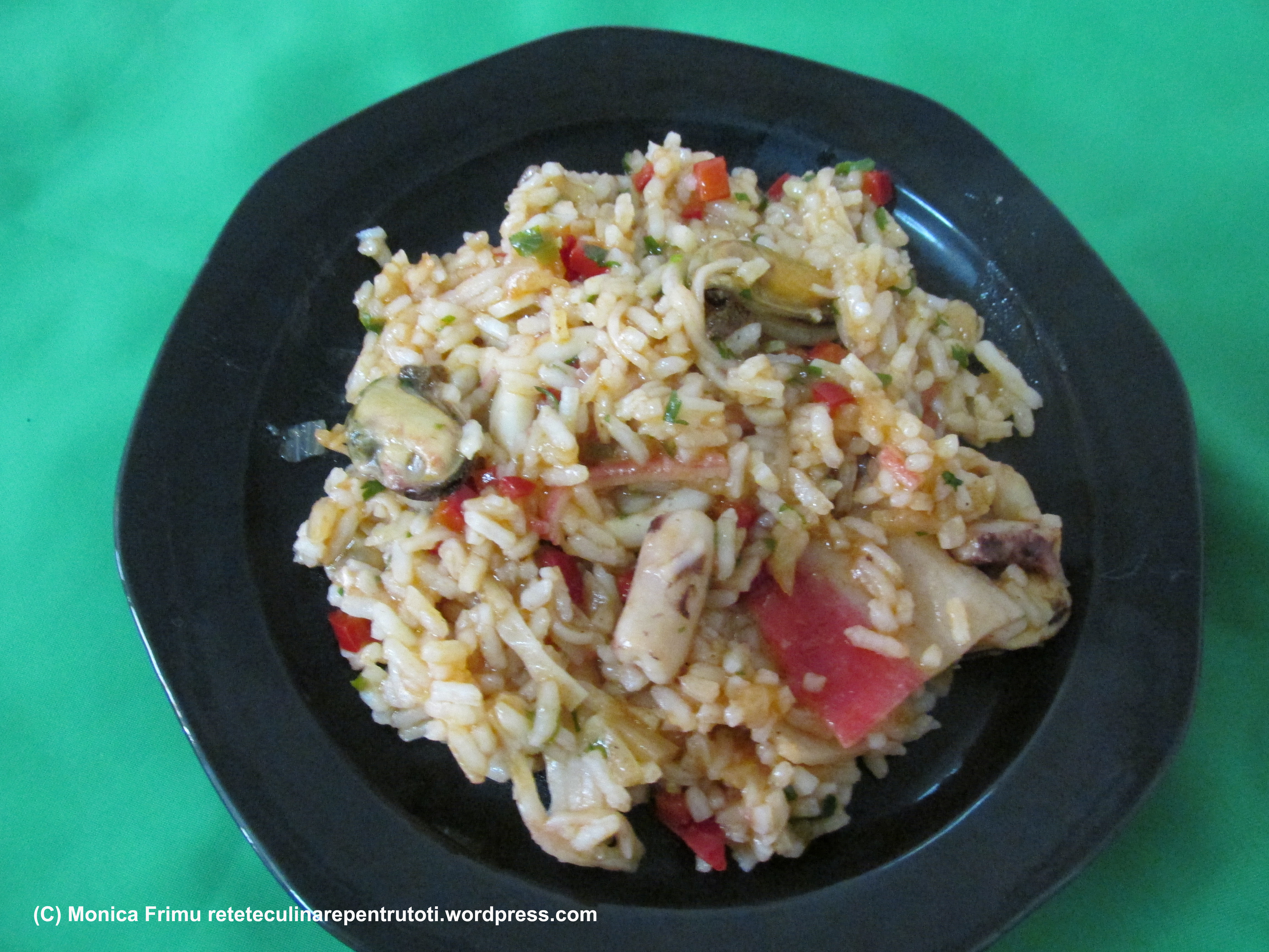 În 2 linguri de ulei de măsline călim ceapa tăiată mărunt, căţeii de usturoi tocaţi, sare, piper, ardeiul iute tocat, apoi adăugăm ardeii tăiaţi cubuleţe până se înmoaie. Turnăm vinul, adăugăm fructele de mare şi când fierb zeama de la ½ lămâie. Mai dăm câteva clocote, adăugăm pasta de tomate desfăcută în apă, sare, piper, coriandru, ţinem pe foc până scade sosul. La sfârşit adăugăm orezul şi pătrunjelul verde tocat, amestecăm până se omogenizează şi absoarbe sosul. Servim imediat.