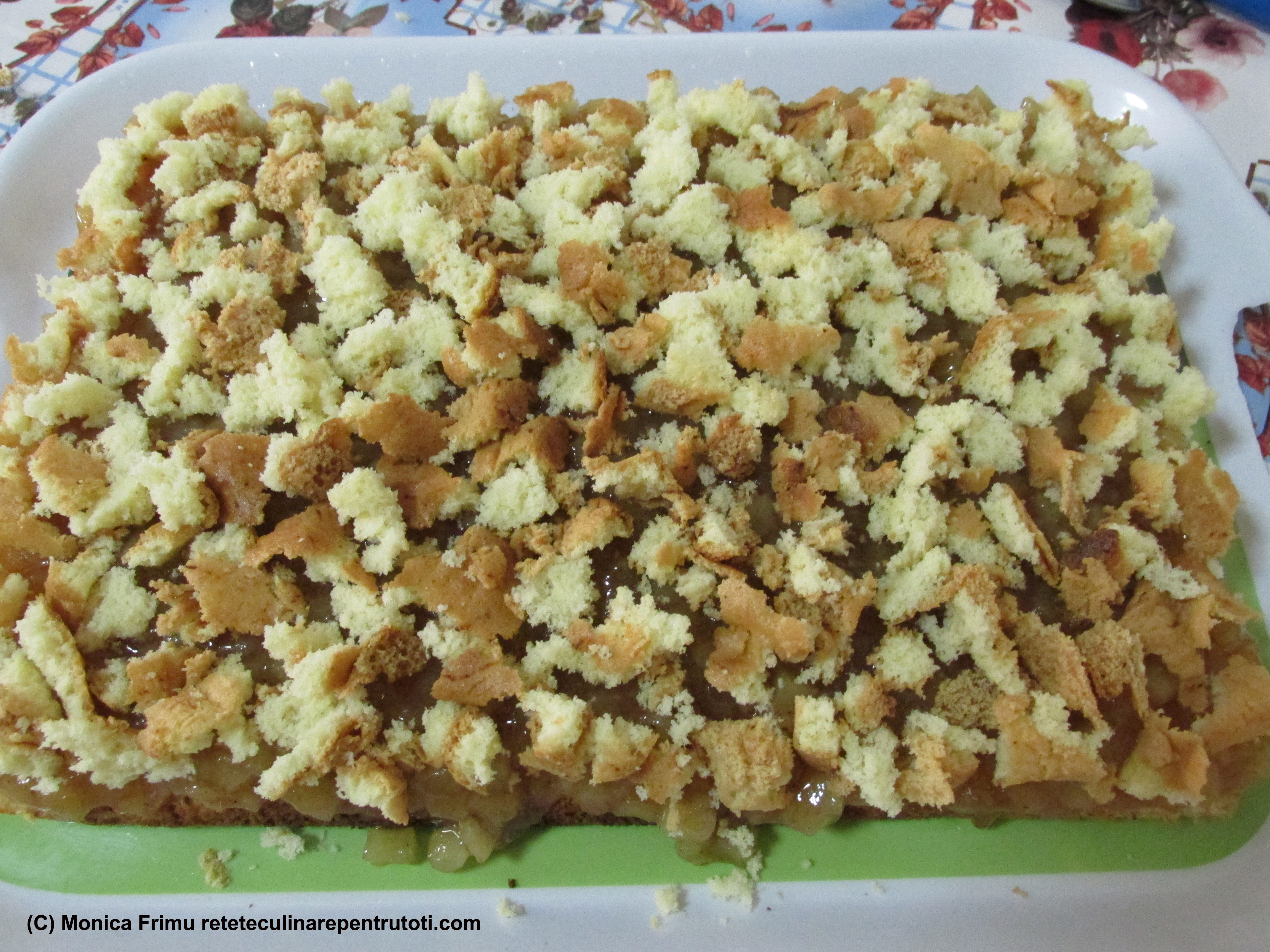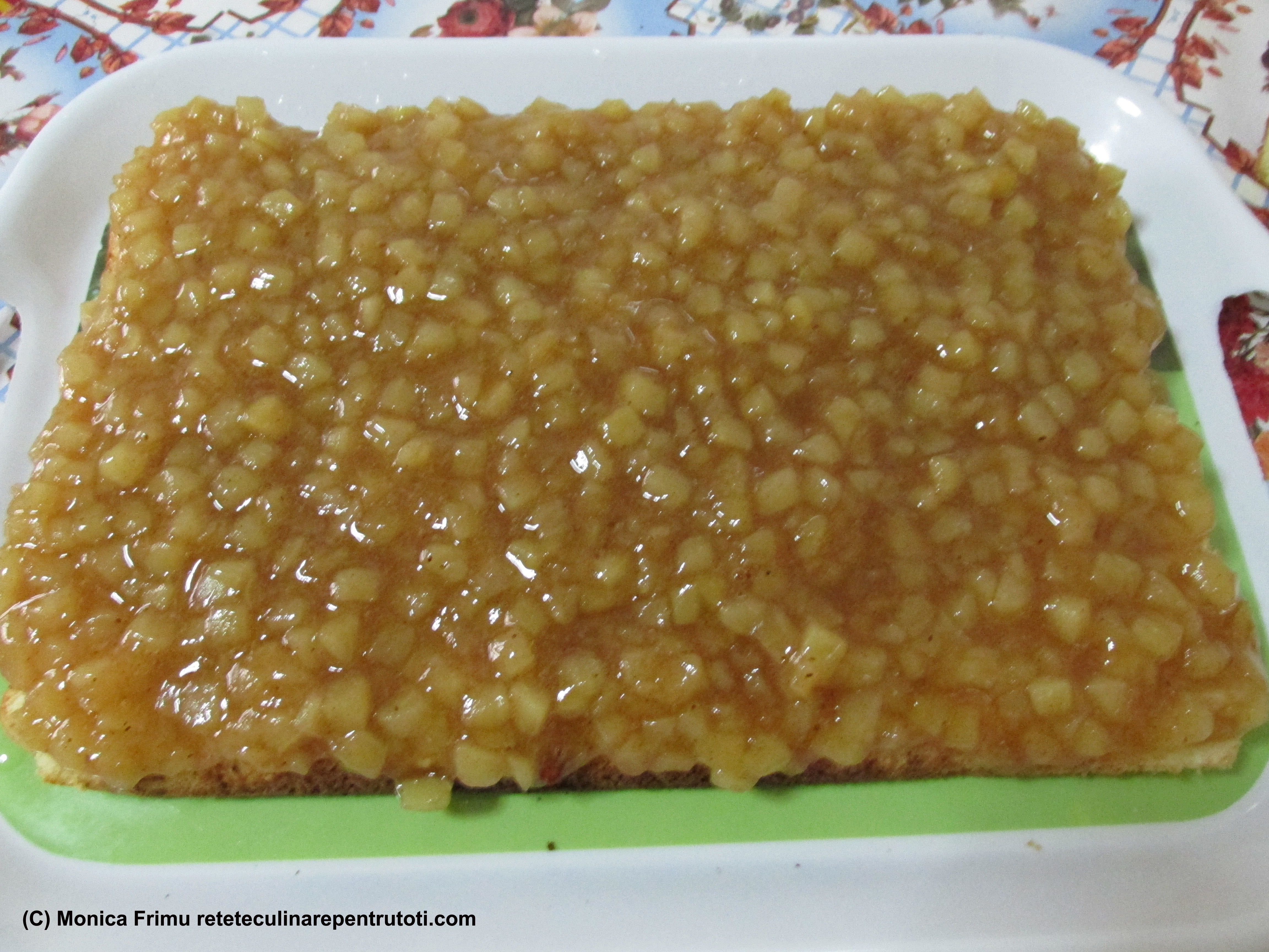 Aşezăm blatul pe un platou, însiropăm, întindem piureul de mere,