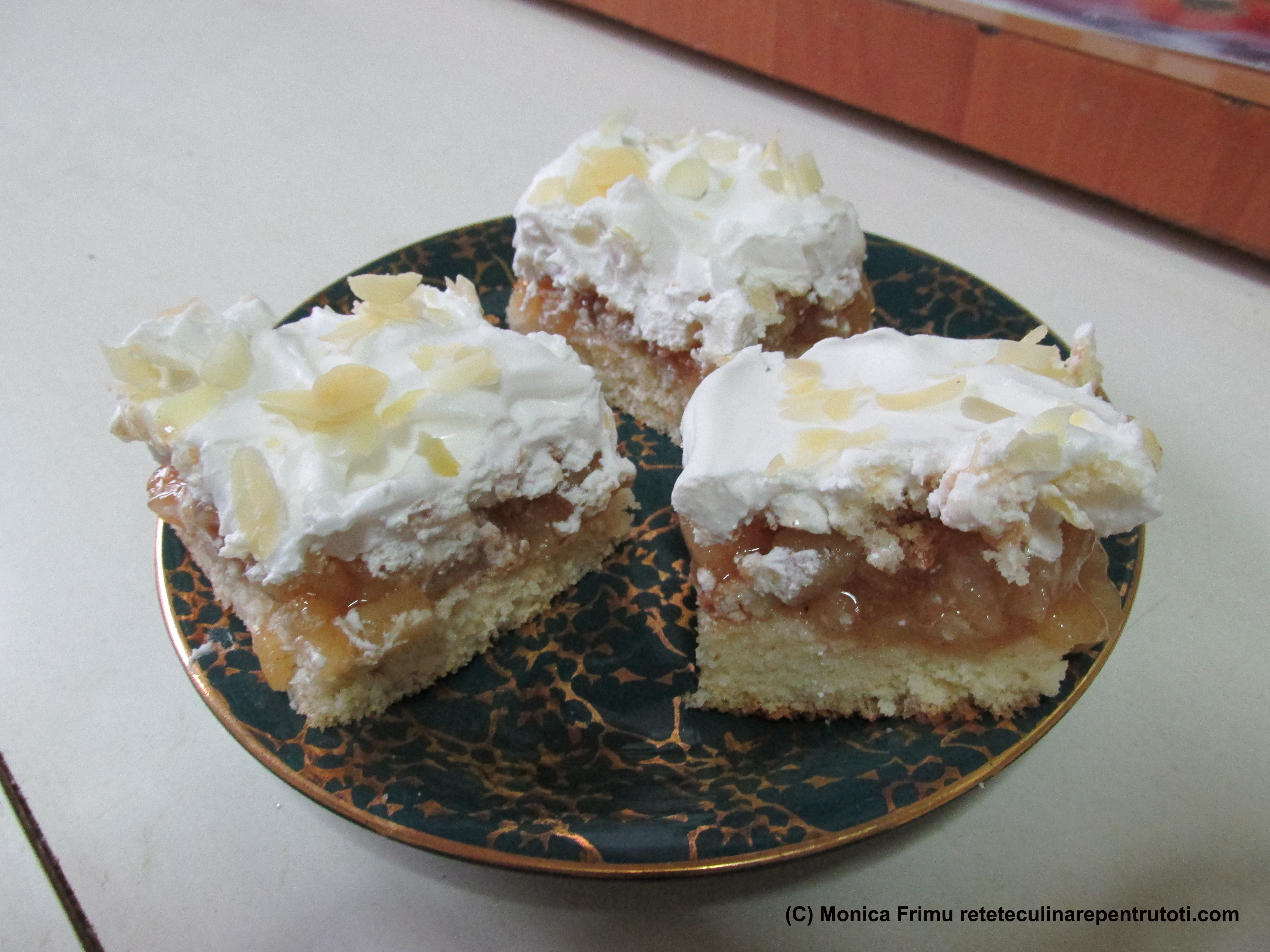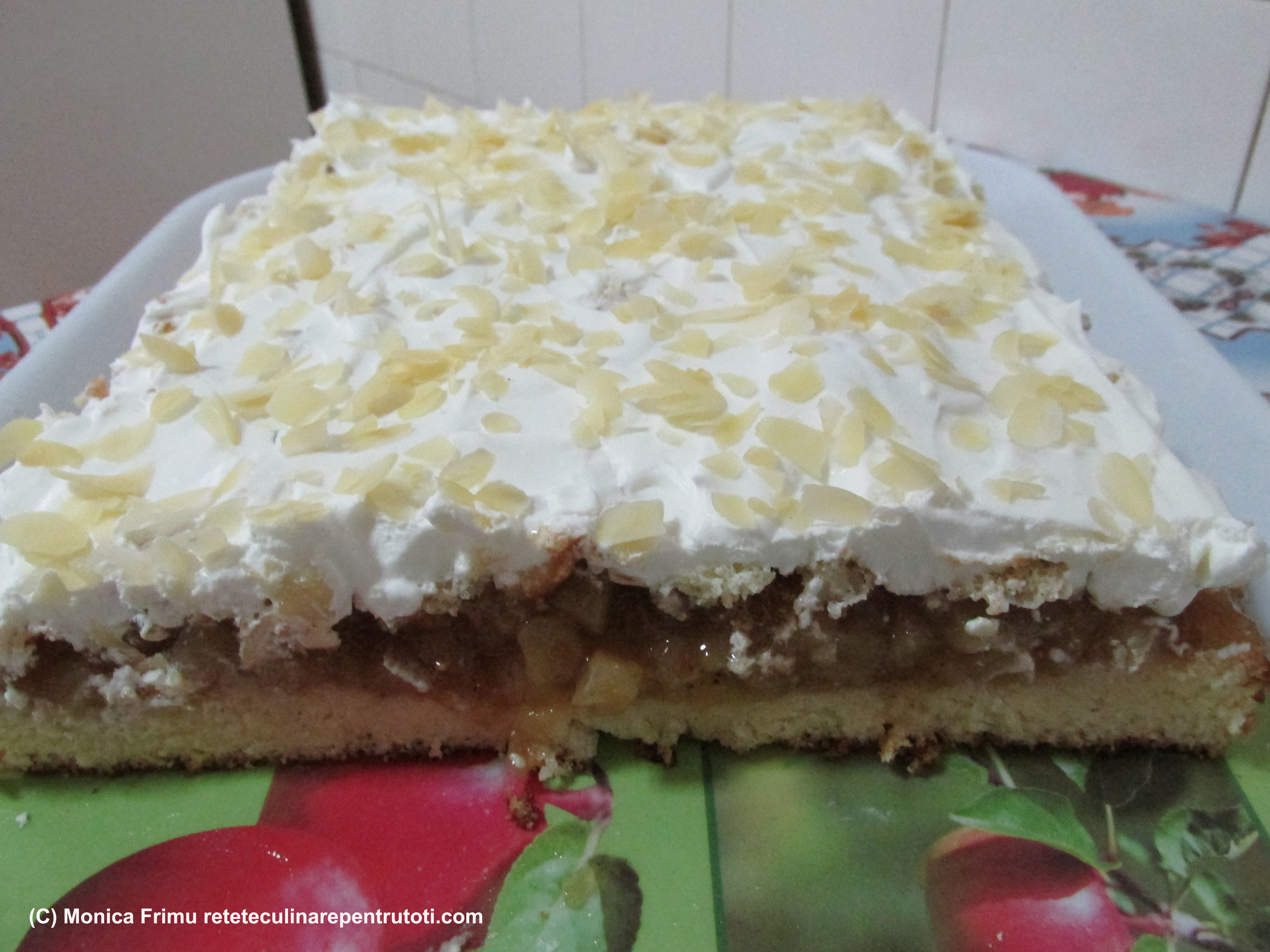PIURE DE MERE: caramelizăm 150 g de zahăr, curăţăm merele, tăiem cubuleţe, amestecăm cu zahărul şi ţinem pe foc până se înmoaie. Scurgem de zeamă, răcim şi adăugăm scorţişoara, câte 1 esenţă de vanilie şi migdale şi 2 plicuri de întăritor de frişcă. Amestecăm bine şi punem la frigider.