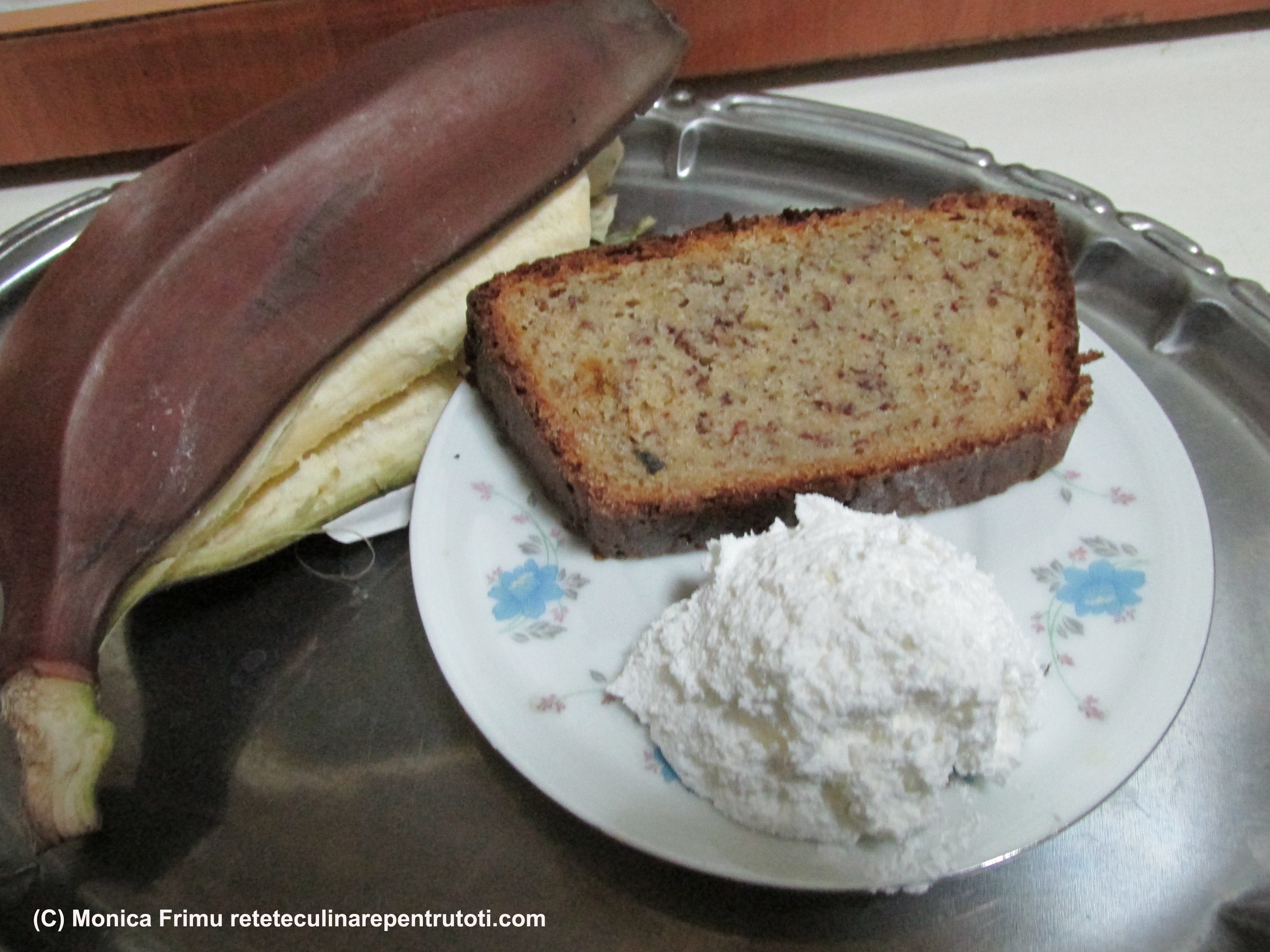 – 200 g margarină, 200 g zahăr, 3 ouă mari, 50 ml lapte, 2 banane mari bine coapte, 250 g făină, 1 plic praf de copt, ½ baston vanilie, 80 g ciocolată albă, frişcă şi banaă roşie pt. servit
