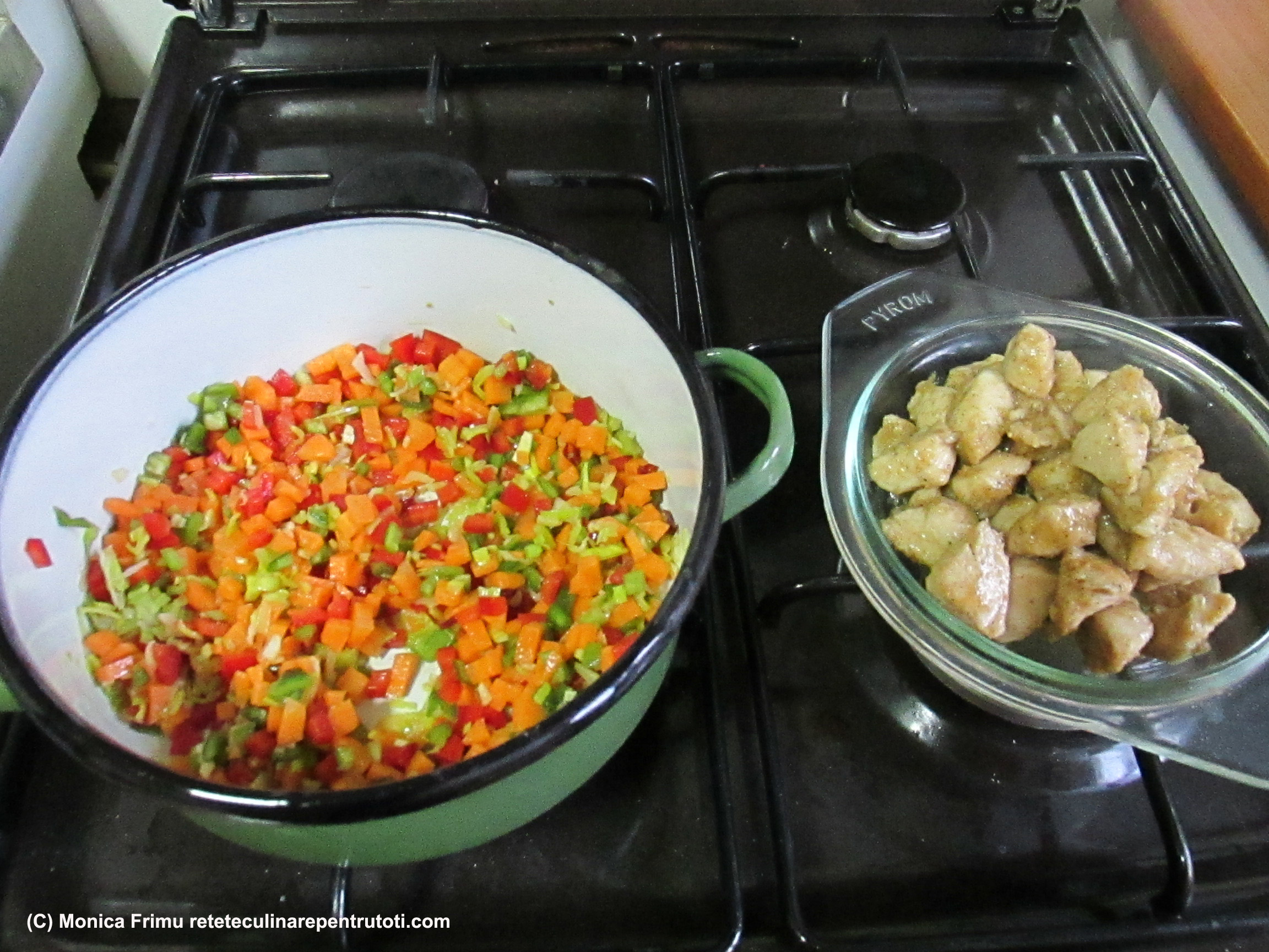 Curățăm și tăiem morcovul şi ardeii graşi cubuleţe, tocăm mărunt ghimbirul şi ardeiul iute, tăiem prazul rondele subţiri.
