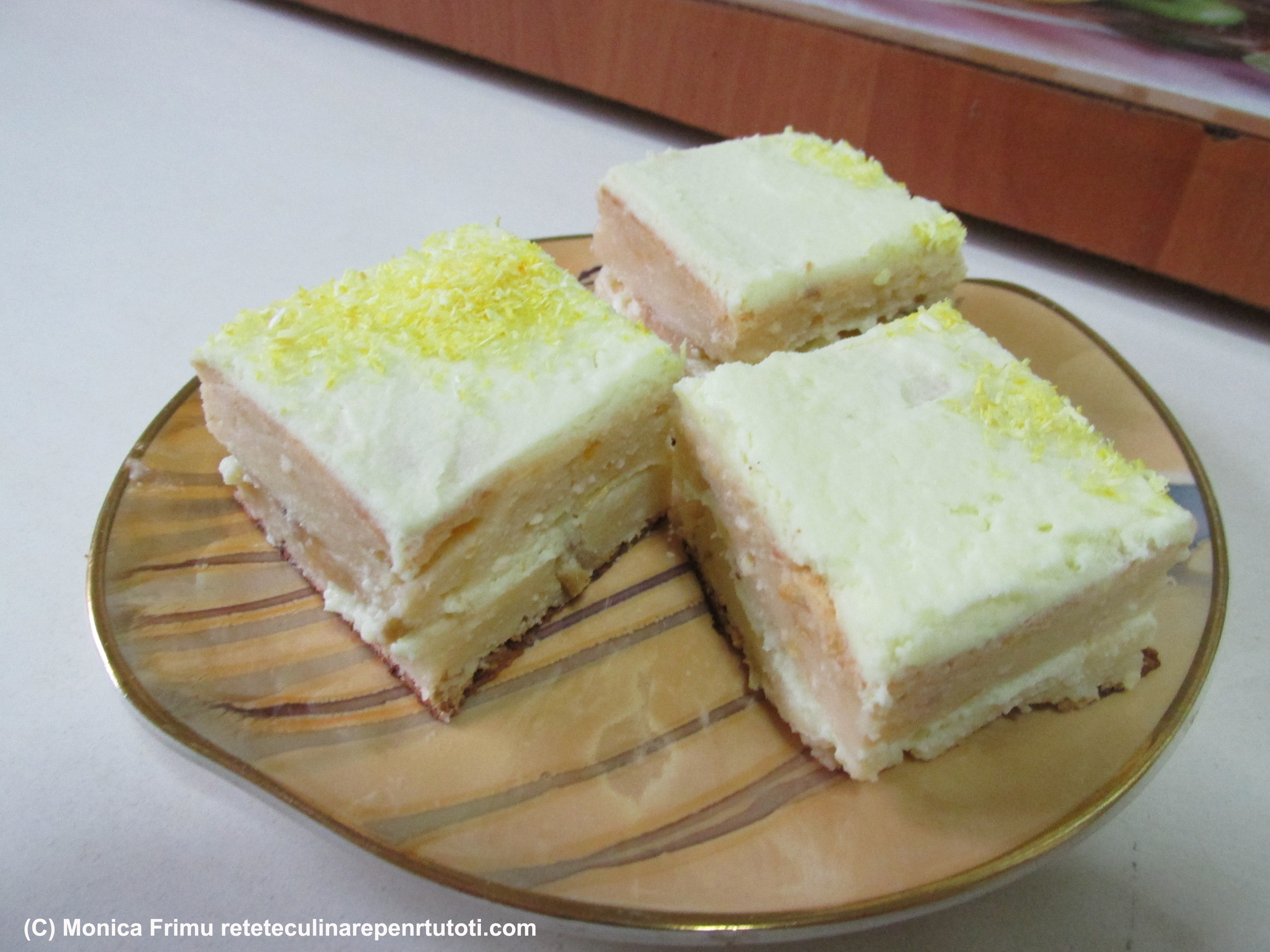 BLAT:  6 ouă, 150 g margarină, 150 g zahăr, 250 g făină, 900 g brânză de vaci, 1 plic Finesse coajă rasă de portocale, 1 aromă de mandarine, 1 compot mic de mandarine (314 g, sare)