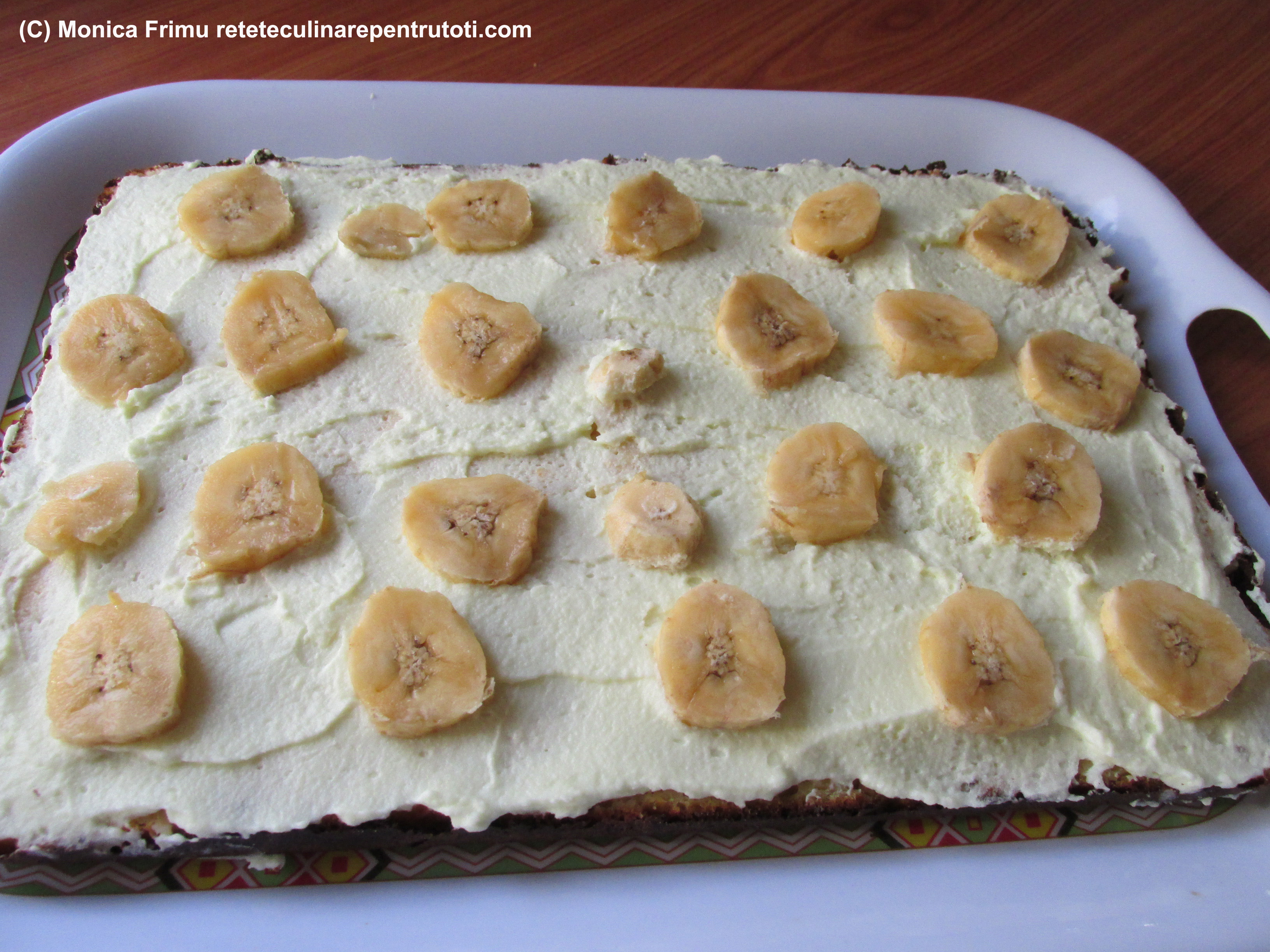 Scurgem mandarinele și tăiem mărunt. Topim margarina, o amestecăm cu zahărul, gălbenuşurile de ouă puse pe rând, esenţa, coaja rasă de portocală, brânza şi mandarinele.  Mixăm albuşurile spumă tare cu un praf de sare şi le încorporăm în compoziţia de brânză, amestecând ușor cu o lingură. Turnăm în tava tapetată cu hârtie de copt și nivelăm. Punem în cuptorul preîncălzit la foc mediu aproximativ 45 minute (testul cu scobitoarea). Răcim, îndepărtăm hârtia şi tăiem pe orizontală, obținând două foi. Amestecăm iaurtul cu zahărul praf și coaja rasă de lămâie. Așezăm o foaie de blat pe o tavă, întindem jumătate din cremă și acoperim cu rondele de banană.