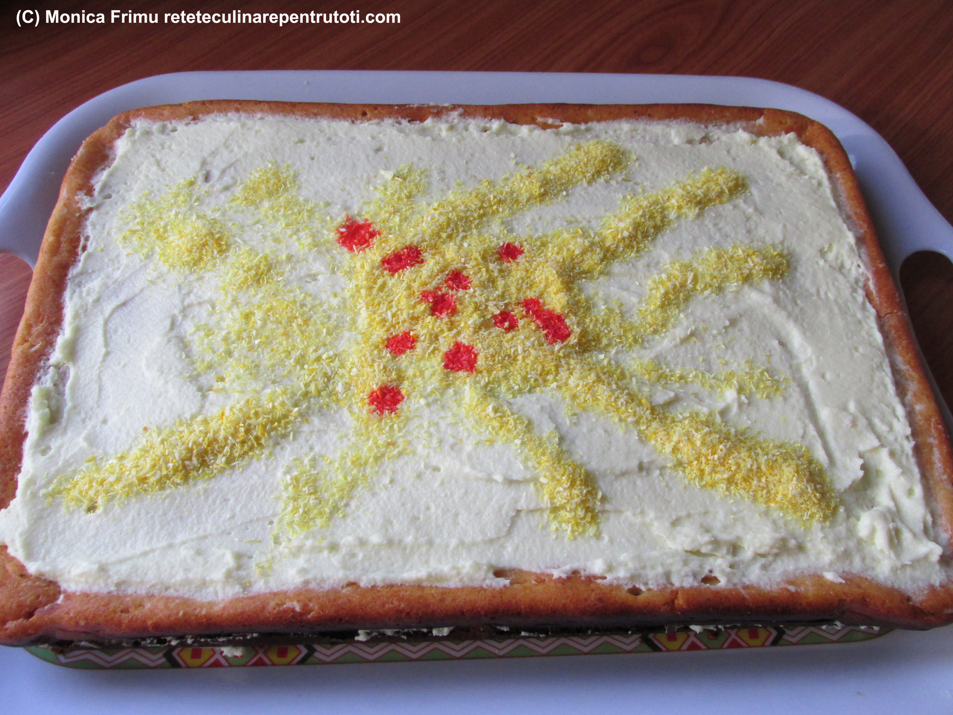 Acoperim cu a doua foaie de blat, întindem peste ea restul de cremă şi ornăm cu coajă de lămâie rasă, nucă de cocos galbenă şi esenţă de mandarine.