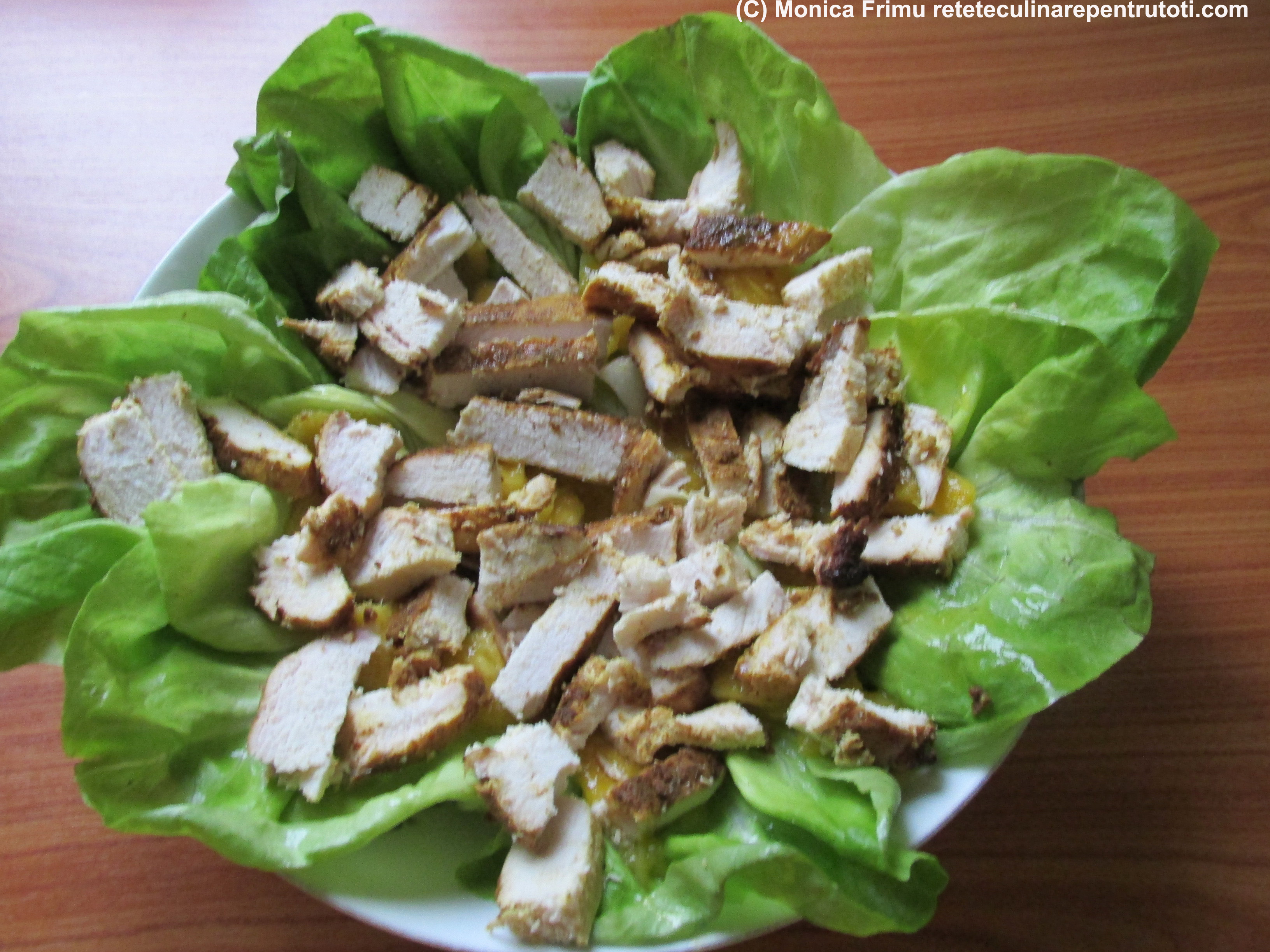 – 250 g de piept de pui dezosat, fără piele, 1 ceapă roşie mică, 1 mango copt, 1 salată verde mică, 4 linguri de iaurt gras, câte 2 linguriţe praf de curry şi seminţe de susan, 2 linguri chutney de mango, 1 lime, 1 linguriţă de ulei de măsline