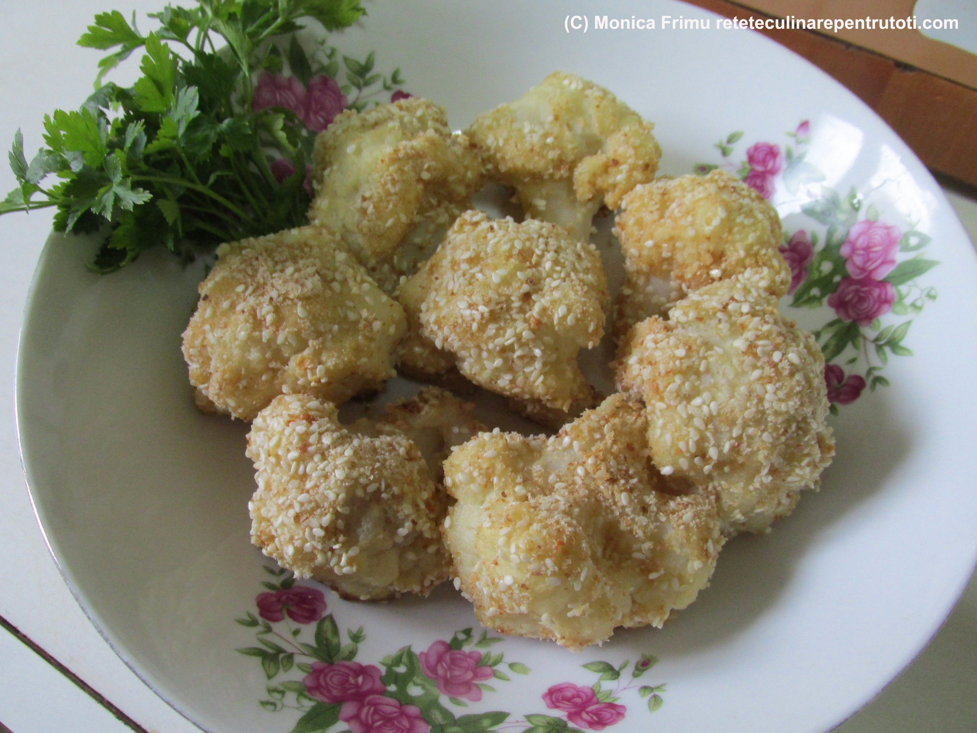 Desfacem conopida în bucăţi, fierbem în apă cu sare, scurgem, le dăm prin oul bătut, apoi printr-un amestec de pesmet şi susan. Le aşezăm într-o tavă cu hârtie de copt unsă cu ulei. Punem în cuptorul preîncălzit la foc mai mare (200) până se rumenesc puţin.
