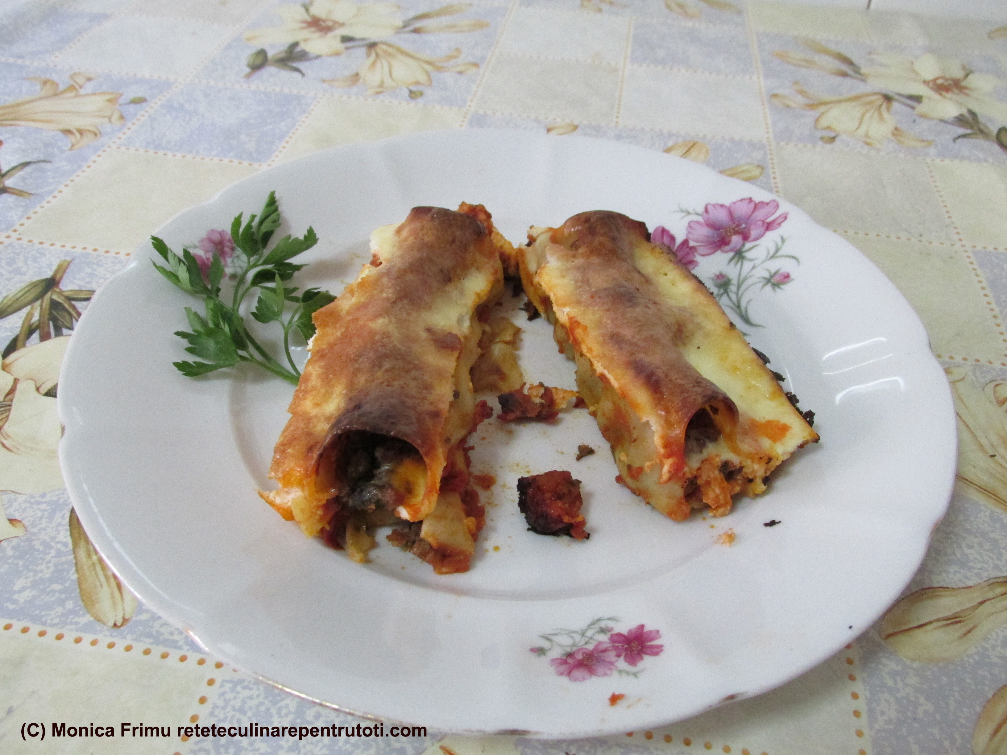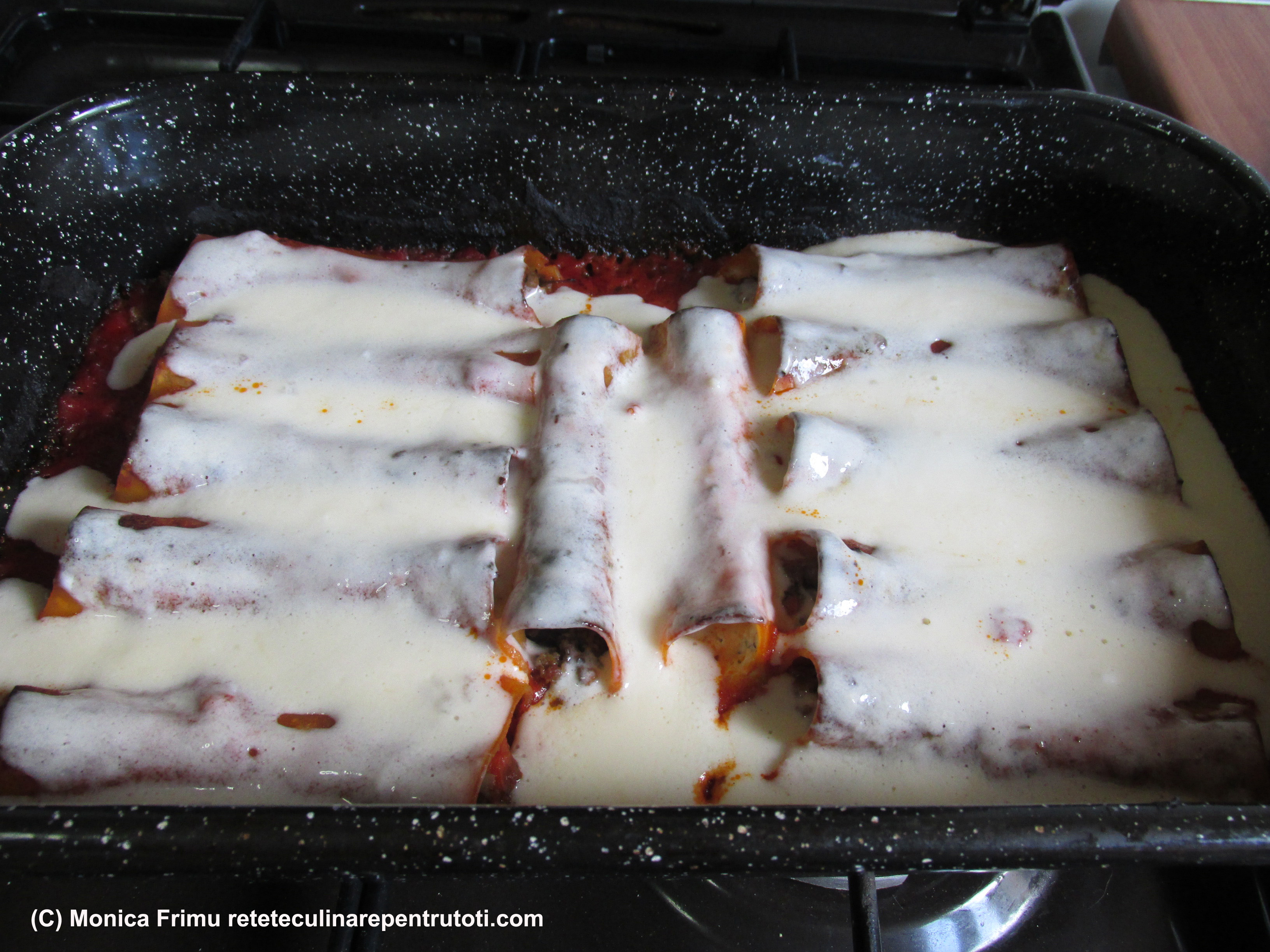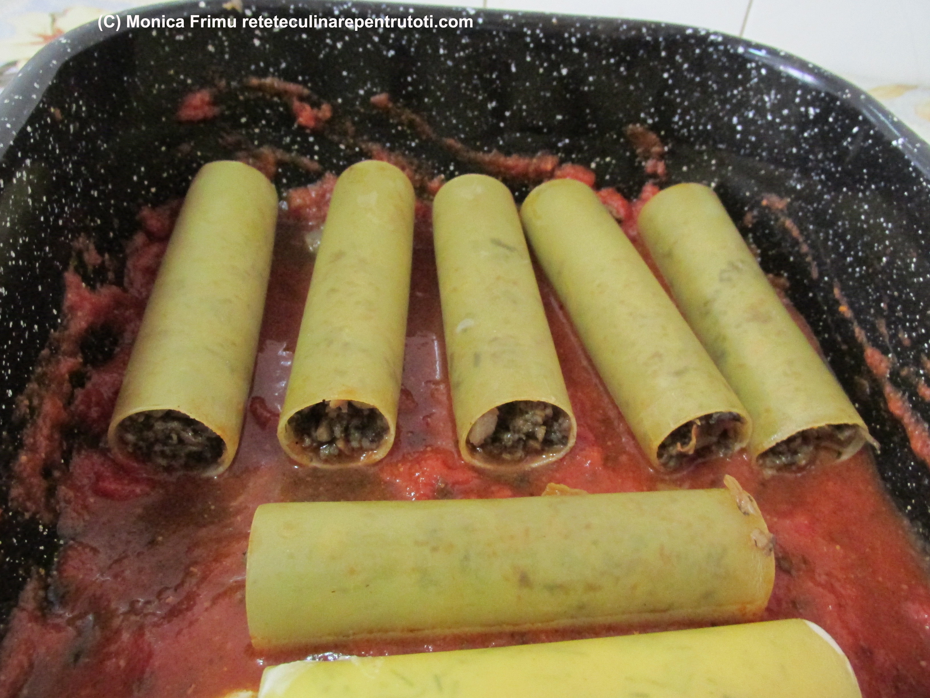 Umplem cannelloni cu compoziţia de carne şi ciuperci. Aşezăm într-o tavă în care am întins sos roşu.
