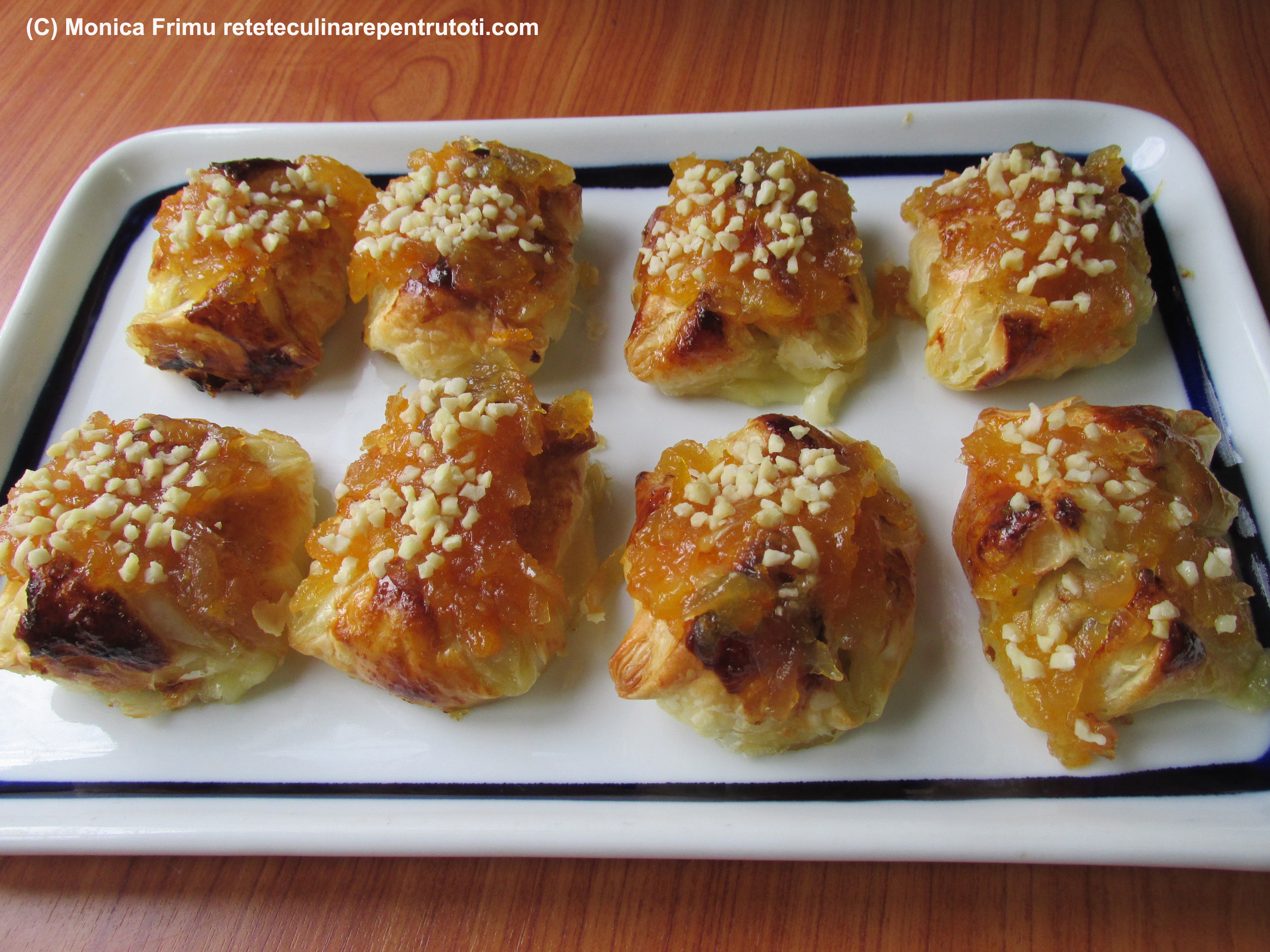 Decongelăm aluatul, îl tăiem în 12 pătrate. Curăţăm bananele, tăiem în patru bucăţi fiecare şi stropim cu suc de lămâie. Pe fiecare pătrat de aluat aşezăm câte 1 bucată de banană. Ungem marginile cu albuş de ou, pliem pentru a acoperi banana și lipim. Le aşezăm într-o tavă tapetată cu hârtie de copt şi ungem cu gălbenuş de ou. Punem în cuptorul preîncălzit la foc mediu (180) aprox. 25 min. Scoatem din cuptor, ungem cu dulceaţă și presărăm migdale. Servim calde sau reci.