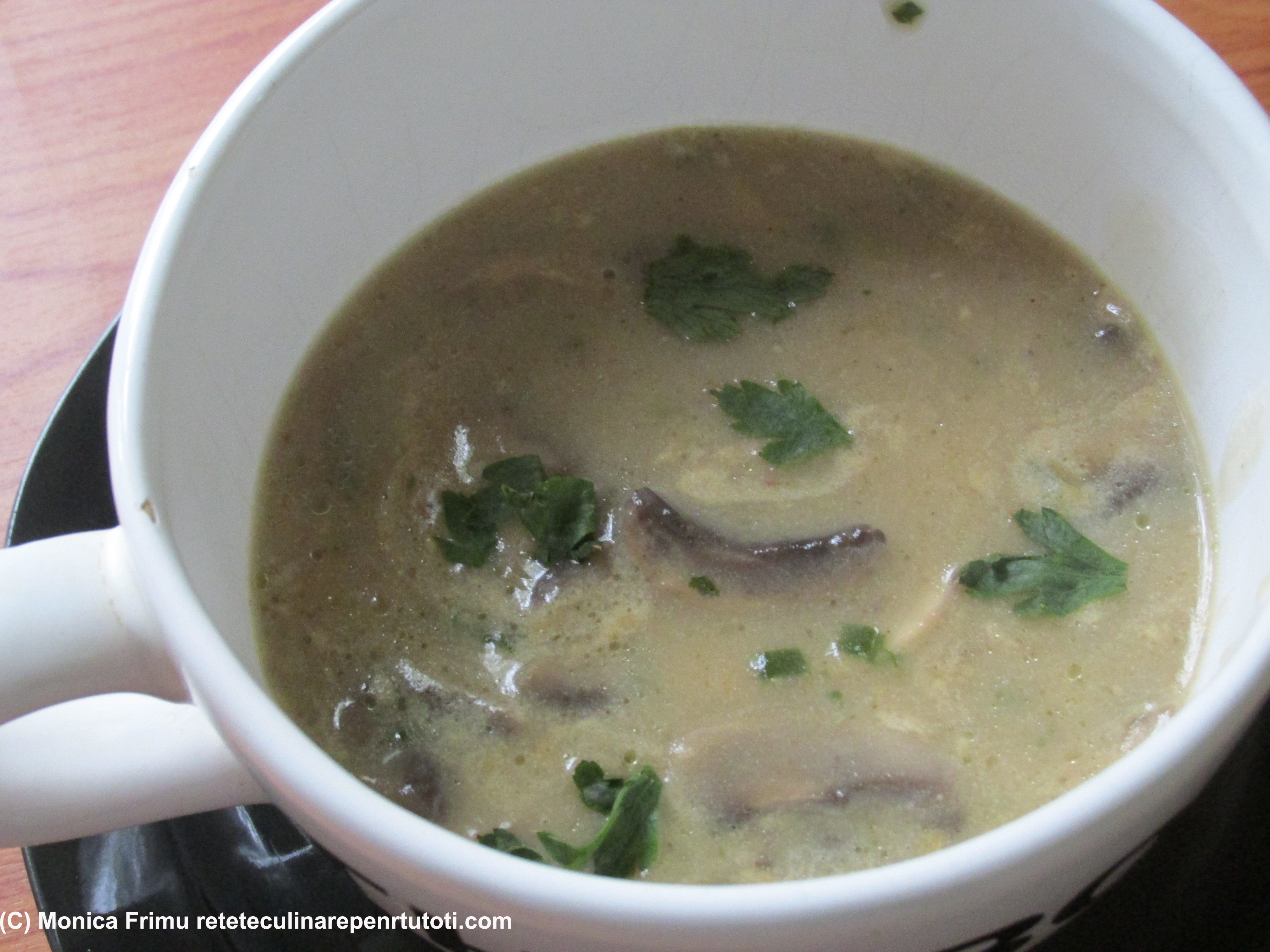Curăţăm şi tăiem ciupercile felii subţiri. Le călim în untul topit împreună cu frunzele de usturoi tocate mărunt, sare şi piper până se înmoaie (să nu scadă zeama). Separat caramelizăm zahărul, adăugăm puţină apă şi fierbem până obţinem un sirop. Adăugăm curcuma, nucşoara, smântâna amestecată cu amidonul şi fierbem până se îngroaşă. Turnăm sosul peste ciuperci, amestecăm 1 minut şi stingem focul. Servim supa cu pătrunjel verde tocat presărat deasupra.