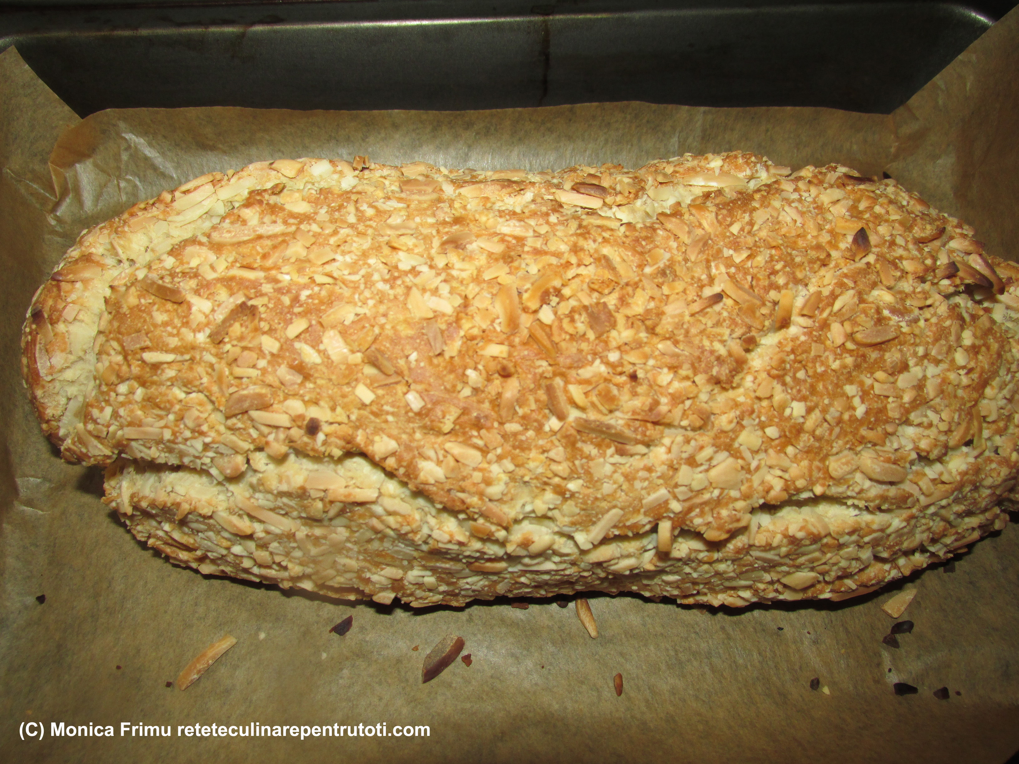 Tăiem felii, le aşezăm în aceeaşi tavă tapetată cu hârtie de copt şi punem în cuptor 5 min. Servim reci.