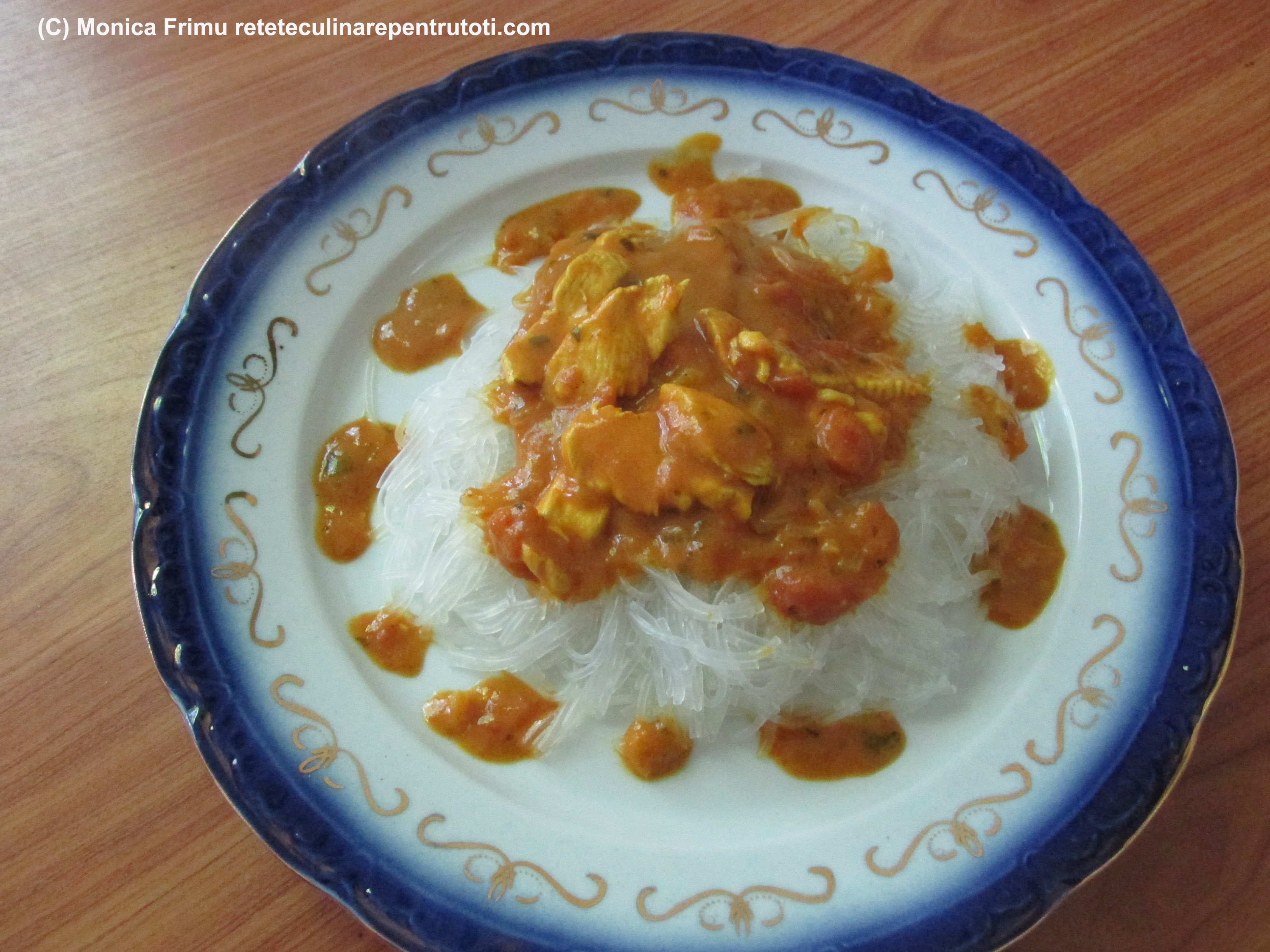 – 1 piept de pui dezosat şi fără piele (aprox. 170 g), 1 ceapă, 3 căţei de usturoi, 1 cutie de roşii în bulion (400 g), 2-3 roşii (aprox. 400 g), 2 linguriţe de praf de curry, 200 ml de lapte de cocos, câte 1 linguriţă de sare şi coriandru uscat, câte 172 linguriţă de praf de chilli şi chimen măcinat, 4 linguri de ulei de susan, 1 lingură de Gustin (amidon alimentar), pătrunjel verde şi seminţe de susan pt. servit