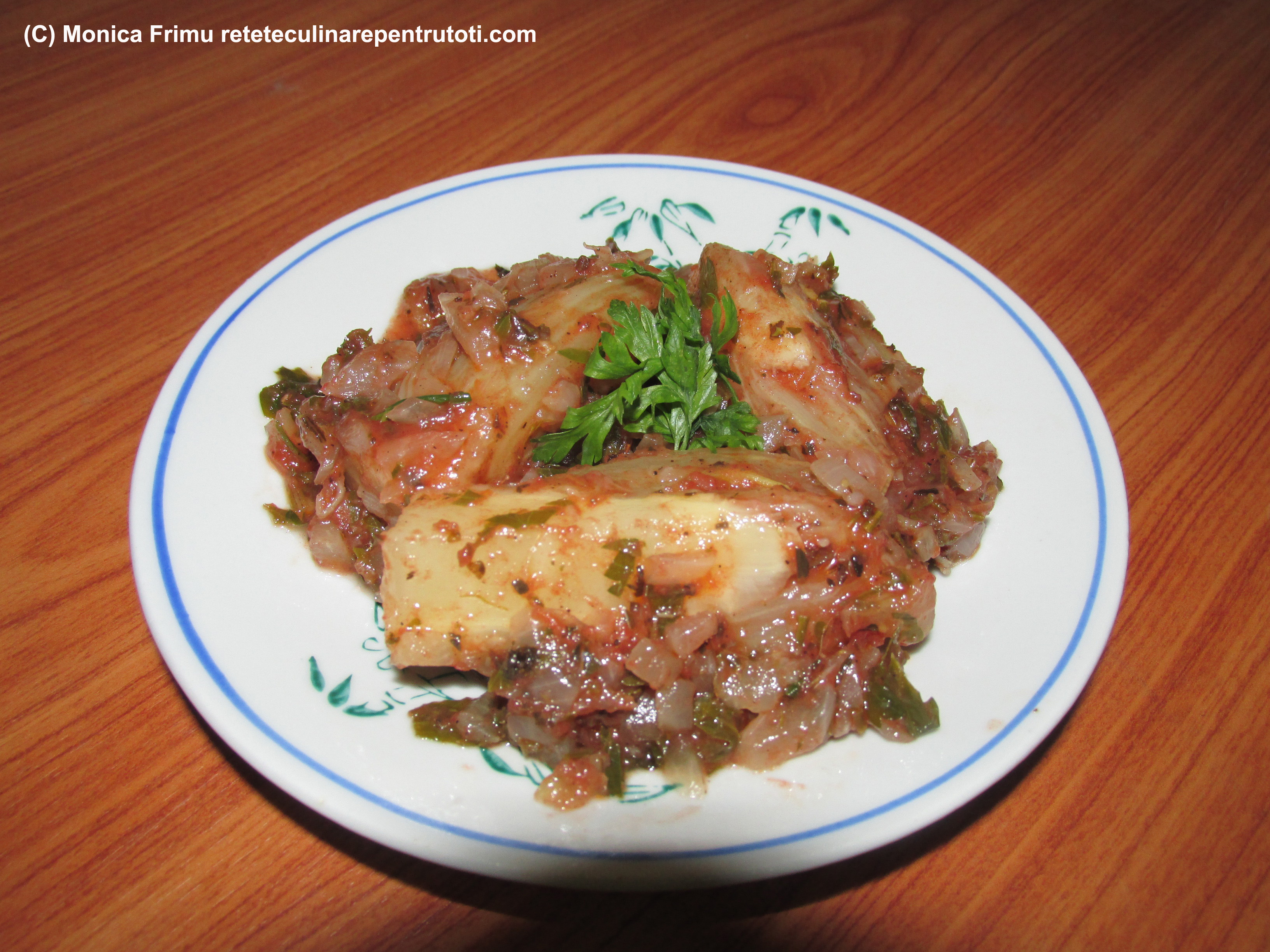 – 3 buc. fenicul, 1 ceapă, 200 ml bulion de roșii, ½ leg. pătrunjel verde, sare, piper, 1 linguriță zahăr, 1 lingură mix condimente Italia