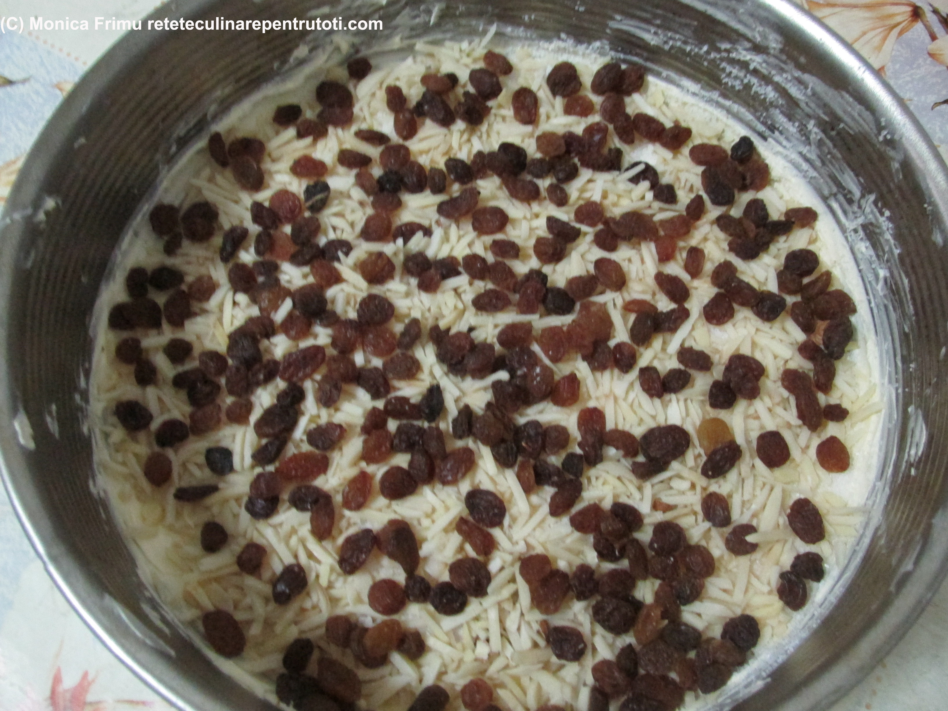 Ungem partea de jos a unei forme de tort cu margarină, presărăm zahărul tos, nucile tocate și stafidele.