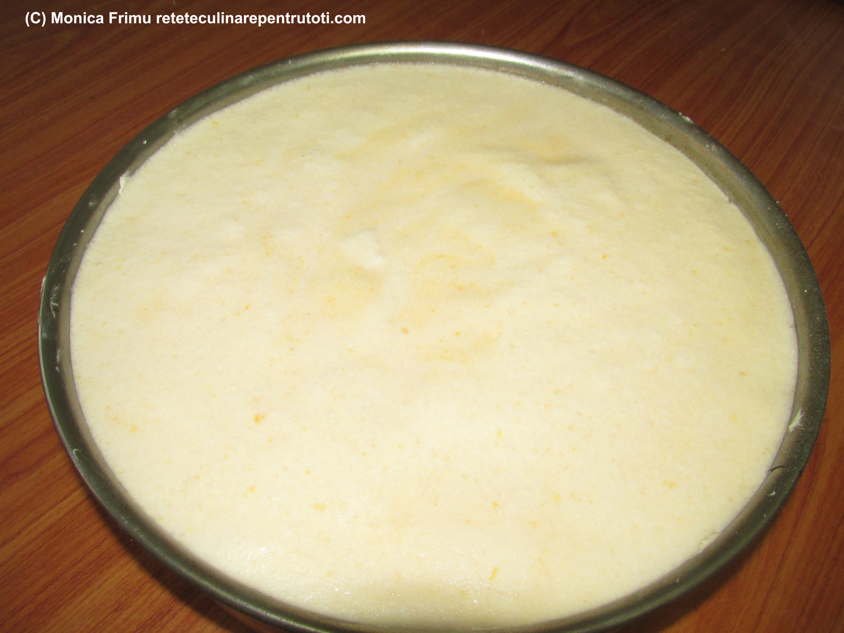 Frecăm spumă gălbenușurile cu zahărul pudră, coaja de lămâie și zeama de lămâie turnată câte puțin. Amestecăm cu făina, la sfârșit cu albușurile bătute spumă și turnăm în forma de tort.