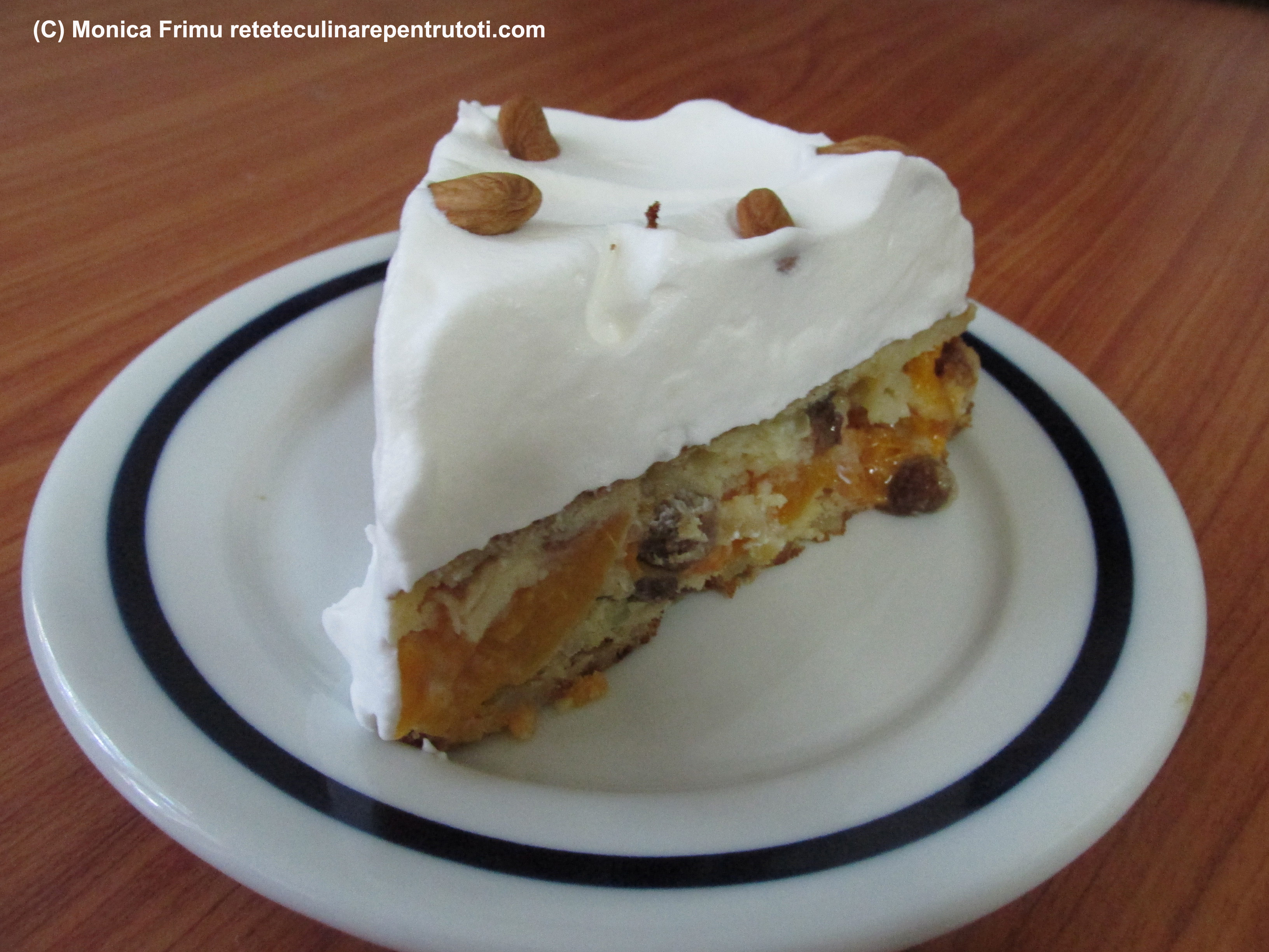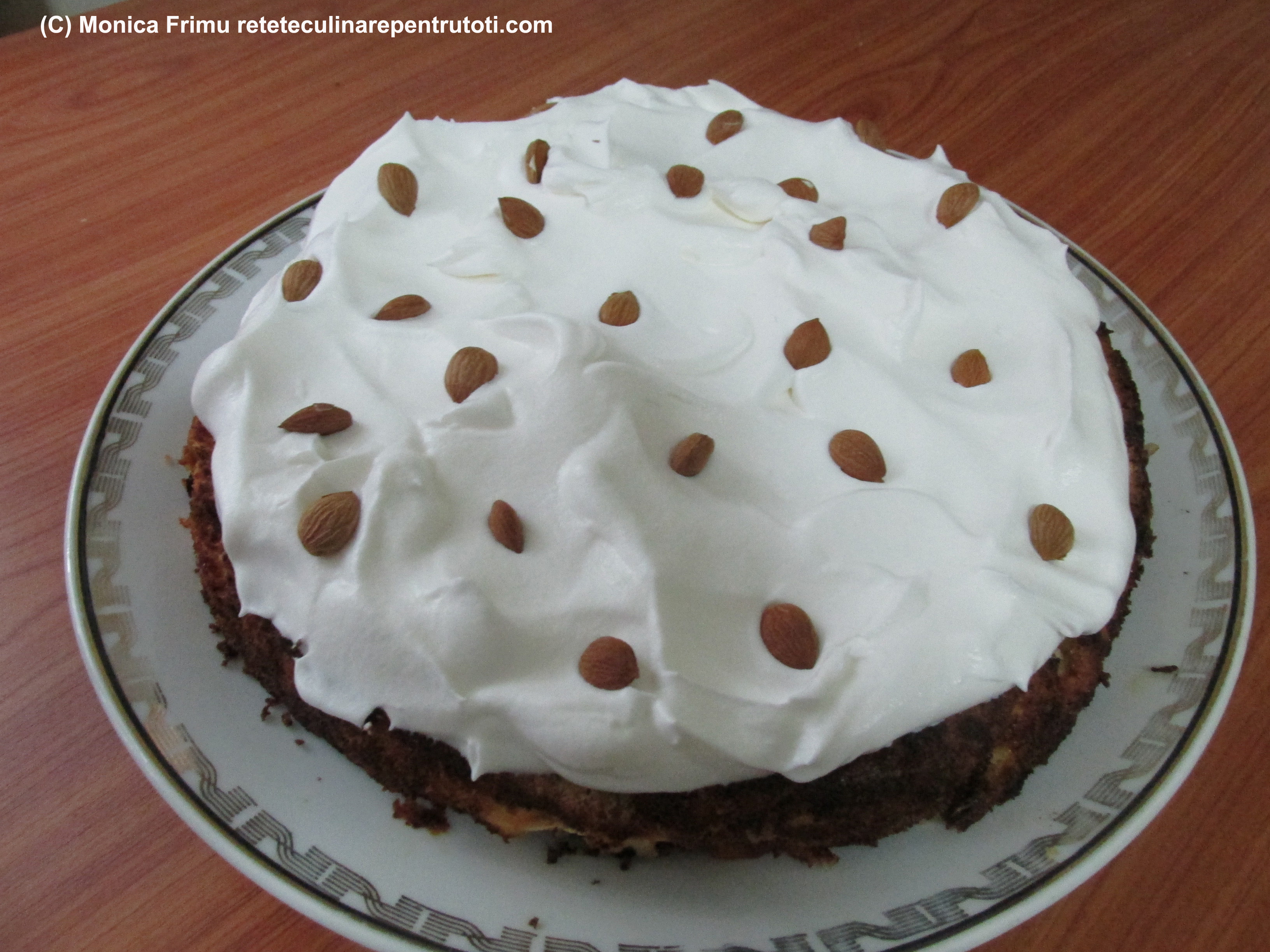 Coacem în cuptorul preîncălzit la foc mediu (180) 30 minute. O răcim puțin, o răsturnăm pe un platou și o lăsăm să se răcească. Ornăm cu frișca mixată tare. Păstrăm în frigider.