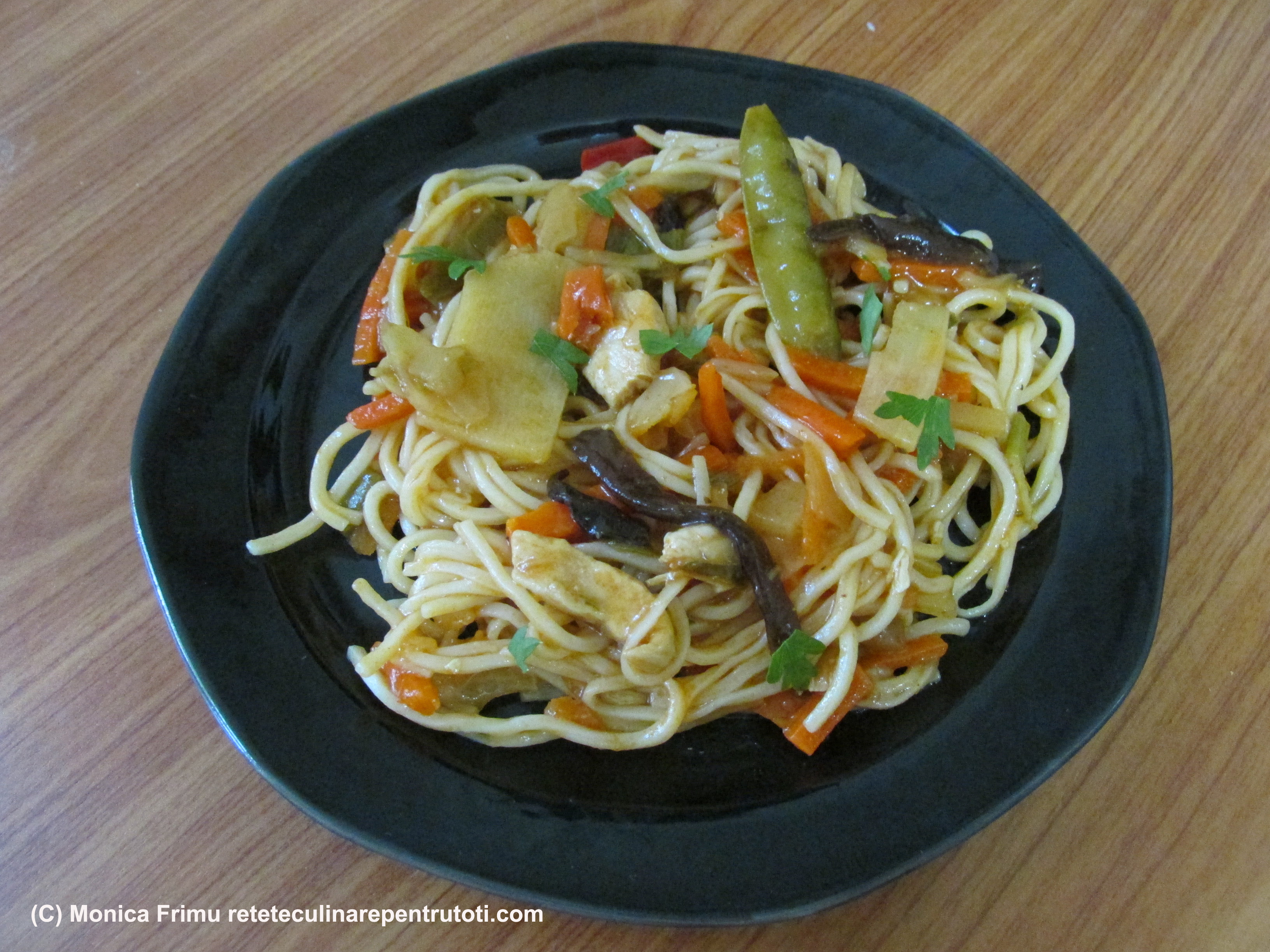 Tăiem carnea fâșii lungi, ardeiul iute mărunt. În uleiul încins prăjim carnea până își schimbă culoarea, adăugăm legumele congelate și fierbem sub capac, până se înmoaie, aprox. 10 min. Adăugăm, sare, piper, sos, amestecăm pe foc 3 min. Fierbem tăițeii în apă clocotită 4 min., scurgem, adăugăm peste legumele cu carne, amestecăm 2 min. și stingem focul. Servim cald presărat cu pătrunjel verde tocat.