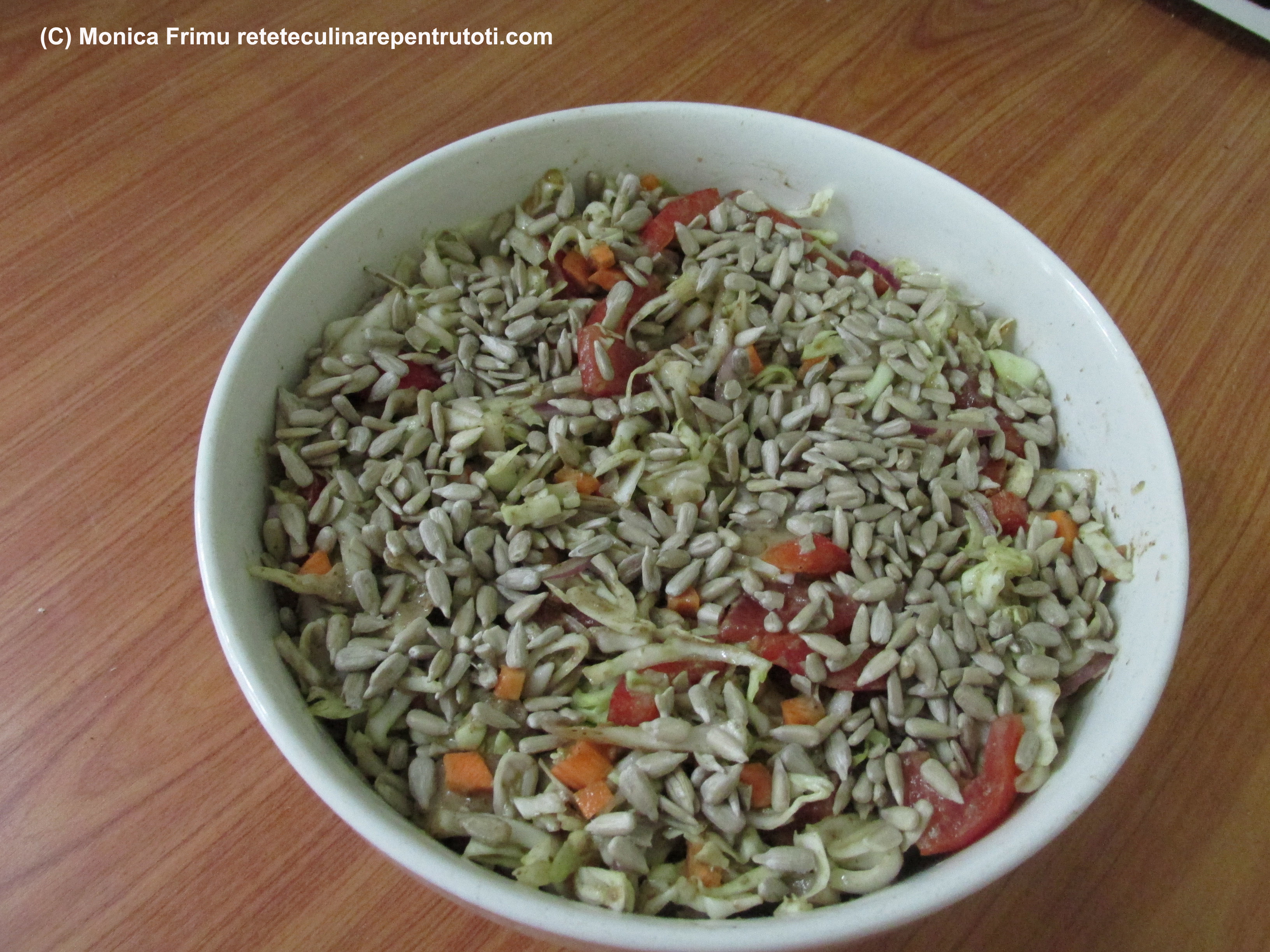 Curățăm și tăiem varza tăiței, ardeiul feliuțe, ardeiul iute mărunt, morcovii cubulețe mici, roșiile cuburi. Într-un bol amestecăm iaurtul cu crema de oțet, cimbru și sos de pește. Amestecăm legumele cu ½ semințe, apoi cu pasta din bol și omogenizăm. Deasupra presărăm restul de semințe. Ținem la frigider 1 oră și servim.