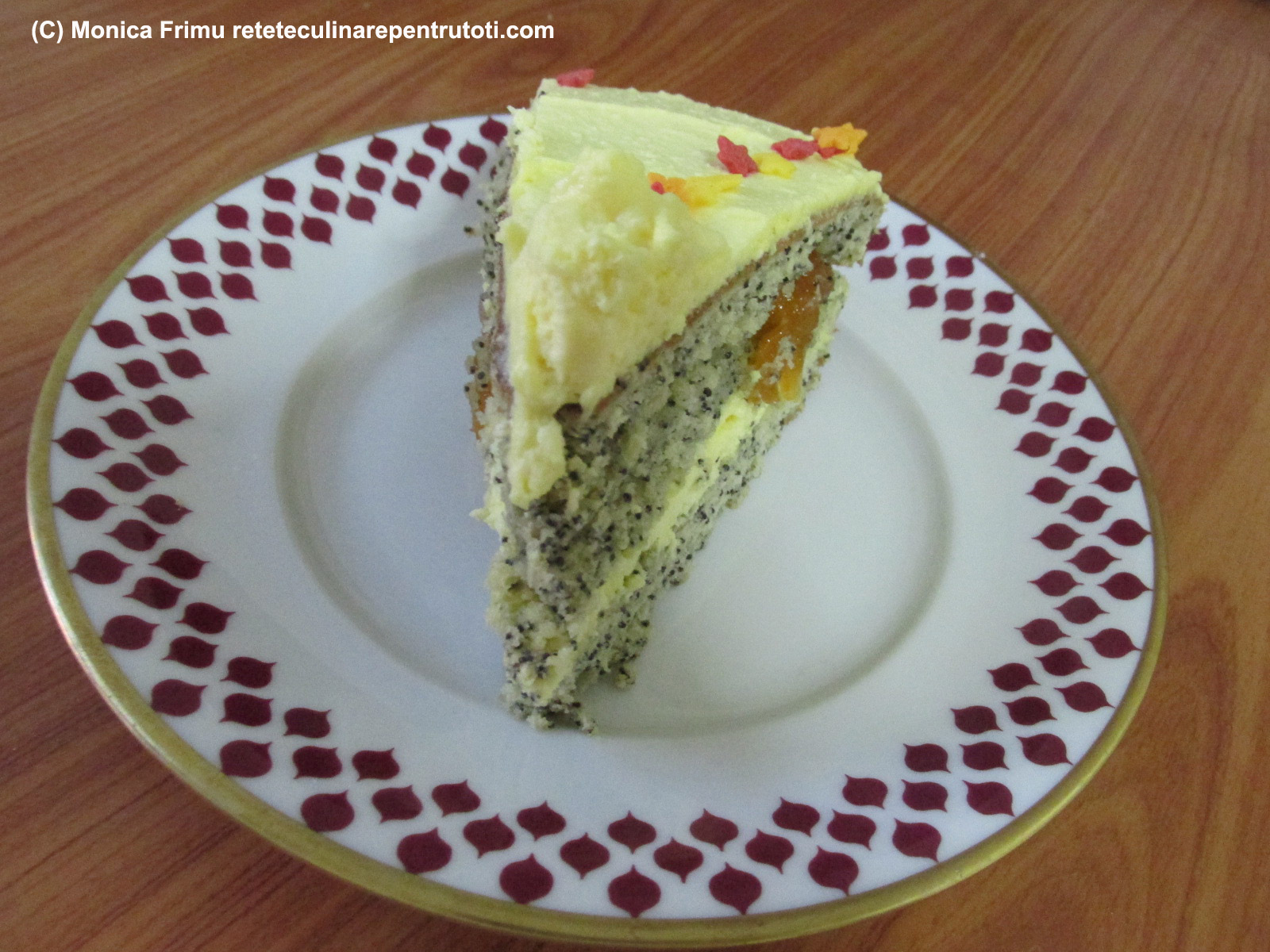 Tăiem blatul 1/3. Pe un platou așezăm o foaie de blat și o ungem cu ½ cremă. Așezăm a doua foaie și întindem dulceața. Deasupra punem a treia foaie, acoperim cu restul de cremă și decorăm cu bomboane de zahăr colorate.