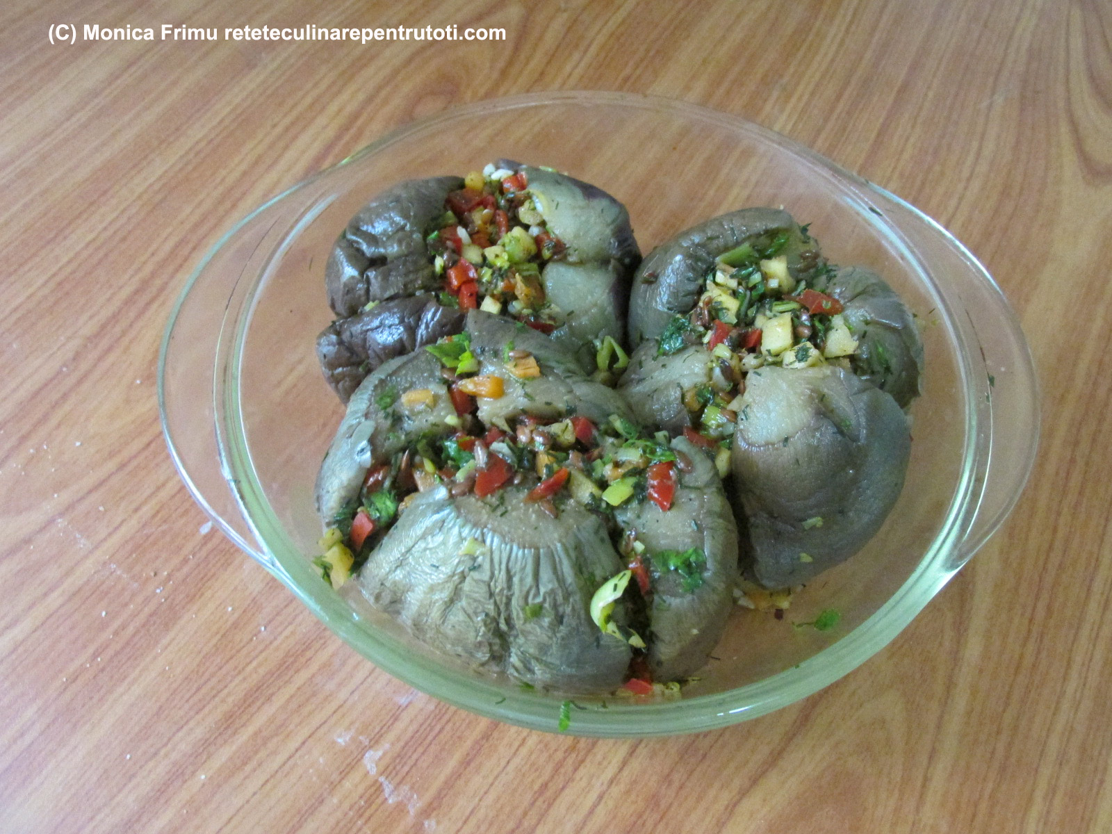 Spălăm vinetele, tăiem codița, crestăm incomplet ¼ și fierbem în apă clocotită cu sare până se înmoaie puțin, apoi scurgem bine. Curățăm rădăcinoasele și usturoiul. Tăiem ceapa și usturoiul mărunt, prazul rondele fine, morcovul, păstârnacul și ardeiul cubulețe mici, roșiile rondele. Tocăm pătrunjelul și mărarul mărunt. În 2 linguri de ulei călim legumele până se înmoaie, în afară de roșii. La nevoie adăugăm puțină apă. Amestecăm cu frunzele tocate, sare , piper și introducem compoziția în despicăturile vinetelor. Într-un vas Yena uns cu 1 lingură de ulei așezăm vinetele.