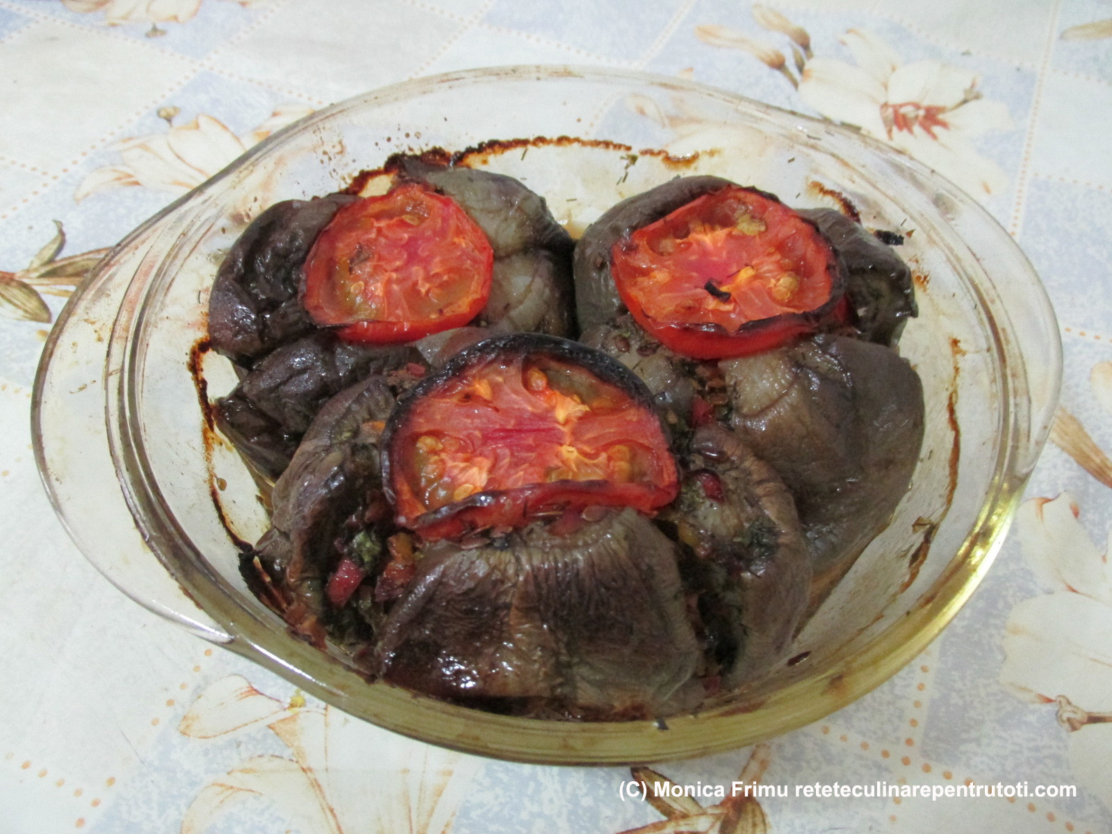 Acoperim cu rondele de roșii. Punem în cuptorul preîncălzit la foc mai mare (200) aprox. 30 min., până se înmoaie. Dacă rămâne multă zeamă scurgem. Servim reci.