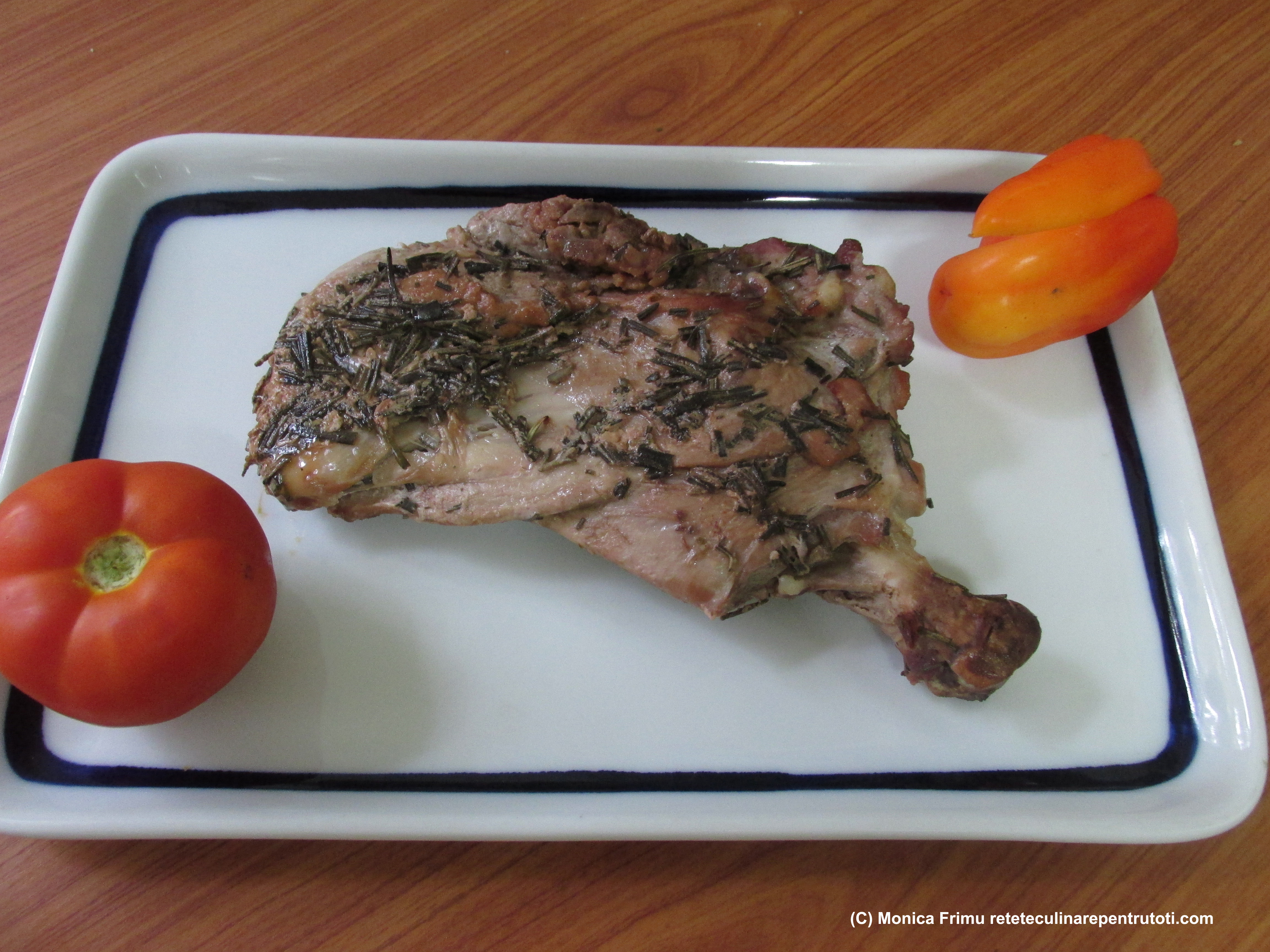 Spălăm pulpa și o așezăm într-un vas încăpător. Amestecăm iaurtul cu rozmarinul, vinul, turnăm peste pulpă și presărăm piperul. Acoperim și punem în frigider până a doua zi. Scoatem la temperatura camerei cu 1 oră înainte de a găti. Așezăm pulpa într-o tavă, turnăm marinada și o sărăm după gust. Punem la cuptorul preîncălzit la foc mediu (180) până rămâne fragedă. (dacă o înțepăm nu curge zeamă).