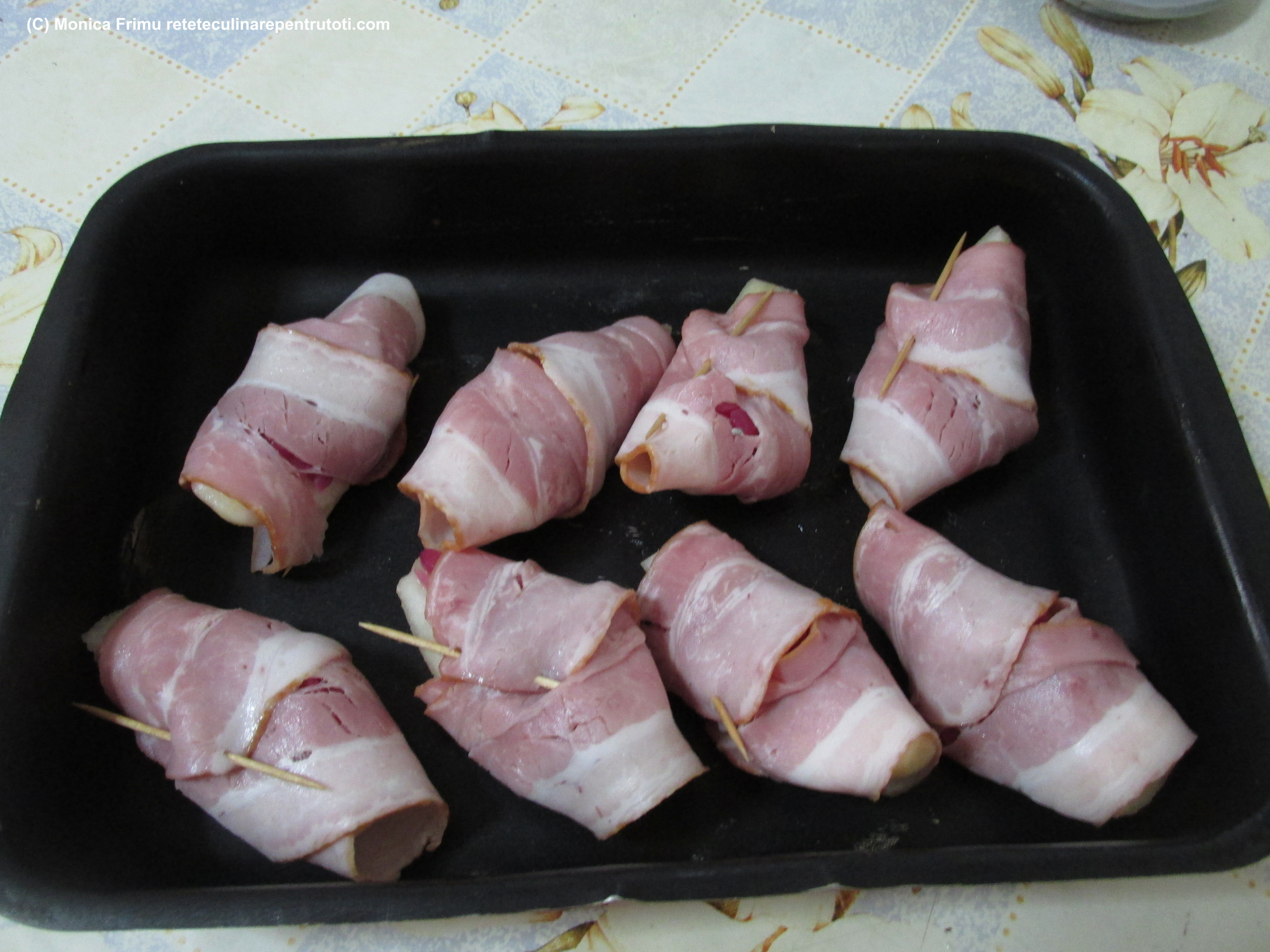 Le învelim în felii de bacon, la nevoie prindem cu scobitoari și le aşezăm într-o tavă unsă cu puţin ulei.