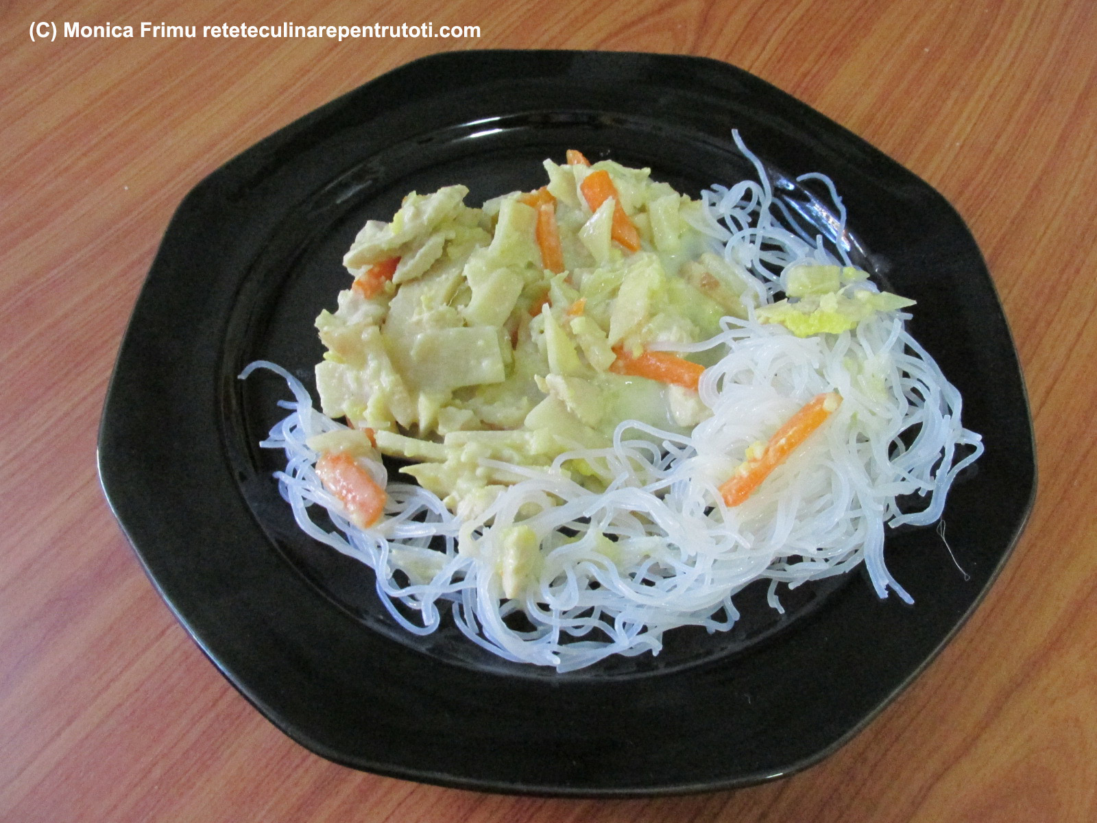 Curățăm și tăiem carnea fâșii, țelina și morcovul bețigașe, ceapa (eu am folosit praz) felii în diagonală, radem mic ghimbirul și usturoiul. Eu am făcut supa din cub concentrat de pui. Scurgem bambusul. În uleiul încălzit prăjim carnea până își schimbă culoarea și scoatem de o parte. Călim pe rând, câte 1 minut, ghimbirul, usturoiul, țelina, morcovul și ceapa. Adăugăm carnea, sosul de pește și supa. Fierbem până se înmoaie. Punem laptele de cocos și amestecăm din când în când până se formează un sos. Servim carnea și sosul cu orez gătit simplu/tăiței de orez.