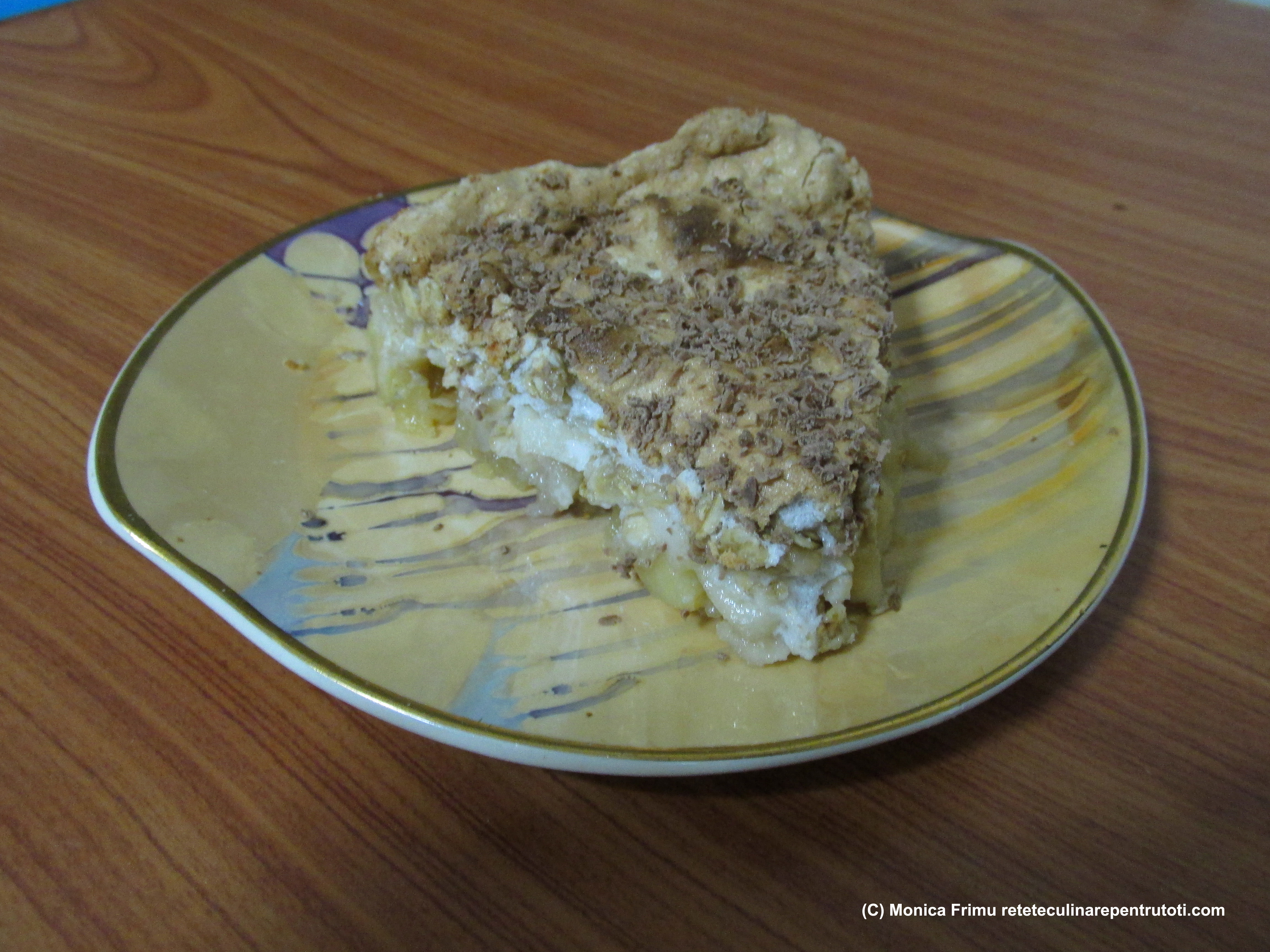 – 4 ouă, 1 pahar fulgi de ovăz, 4 mere, 1 lingură de făină, ½ plic praf de copt, unt și pesmet pt. tavă